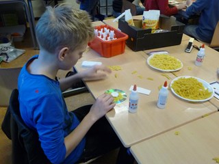 De cd’s werden gebruikt om te versieren met verschillende soorten pasta. Zo ontstond er een leuke houder voor een waxinelichtje. De houder werd daarna nog gespoten in goud of zilver.