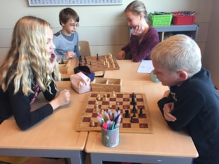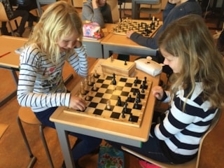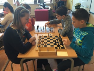 Na het kijken van de film hebben we in de klas de verschillende schaakstukken besproken en hebben we geoefend met hoe elk stuk mag bewegen over het bord. Daarna zijn we oefenpartijtjes gaan spelen. In het begin was het nog even wennen en hulp vragen aan elkaar. Even later werden er al truckjes zoals het herdersmatjes, korte en lange Roccade enz. toegepast. Er was nu genoeg geoefend. Tijd voor het begin van de competitie dus!