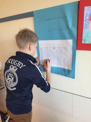 Alle kinderen spelen tegen elkaar en houden de scores bij op de lijst die in de klas hangt. Ook speelt elk kind een potje tegen de juf. Voor het eind van het schooljaar zullen we weten wie de schaakkampioen van groep 8A is!