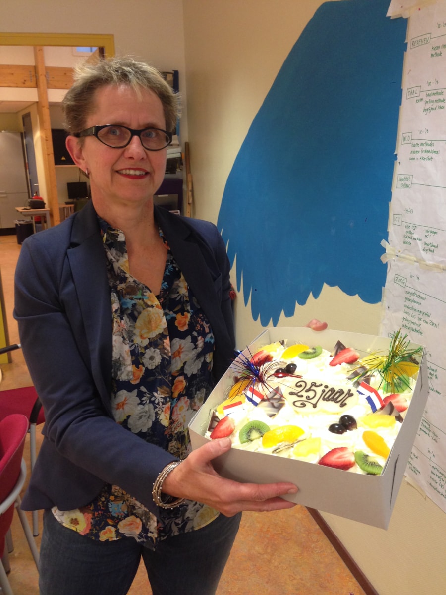 Dinsdag was juf Ans de jubilaris! Ze werd ’s morgens toegezongen door de groepen 8. Er werd een gezellige dag van gemaakt waarbij juf Ans trakteerde. Vrijdag kwam groep 6 met een zelfgebakken taart aan.