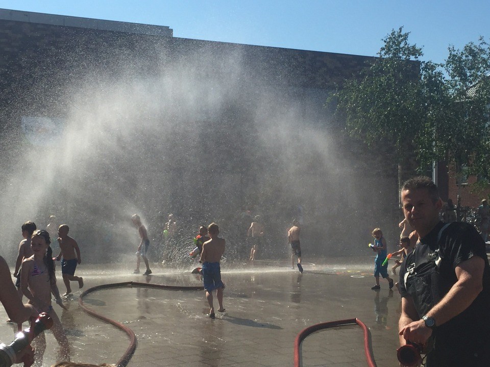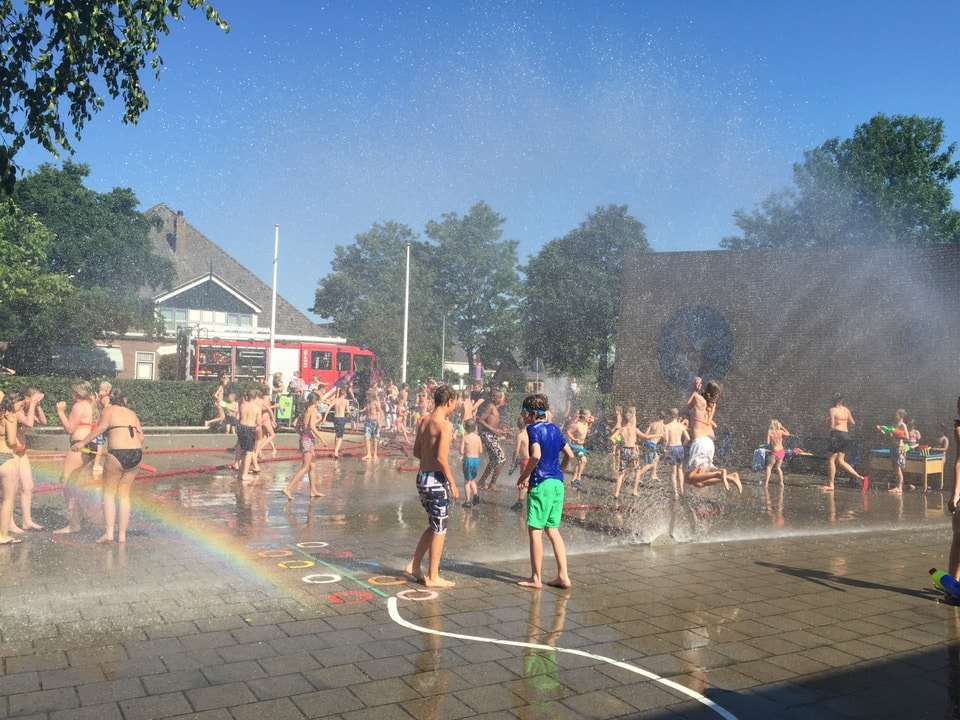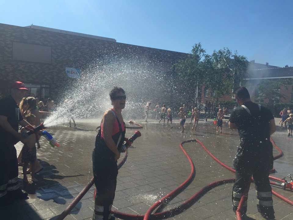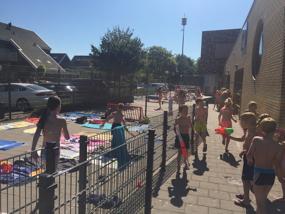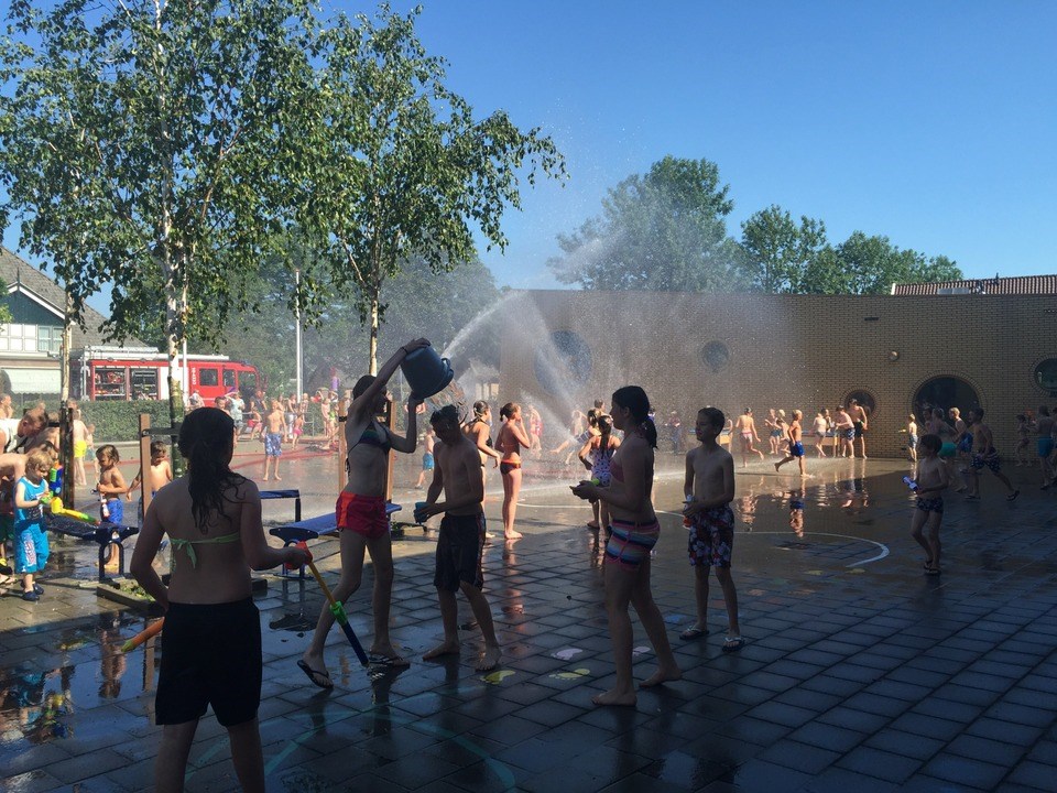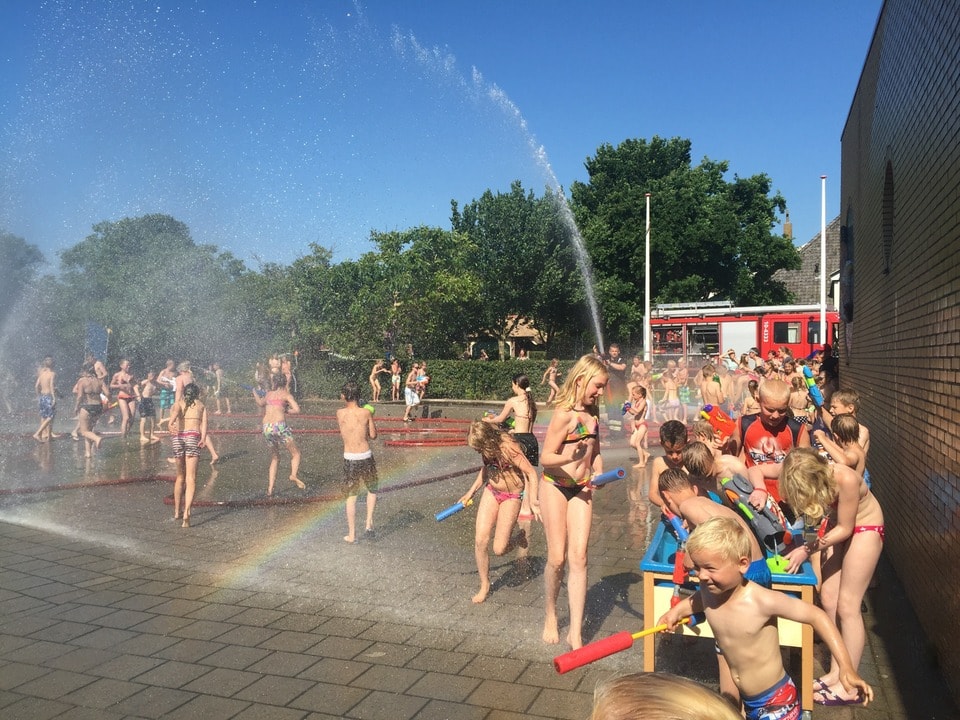 Afgelopen woensdag was het groot feest op het schoolplein. Dankzij de hoge temperatuur kon er een waterfeest gehouden worden! We hadden Ton Dekker van de brandweer gebeld. Hij was meteen enthousiast en regelde er andere brandweermannen en een brandweervrouw bij. Om 10.30 uur kwamen zij met de brandweerauto bij school aan. De slangen werden uitgerold en er stonden al snel 2 grote waaiers te sproeien op het plein. Er werden nog 3 slangen uitgerold om lekker mee in de rondte te spuiten. Alle kinderen van groep 1 t/m 8 spreiden hun handdoek op ons ”strand” (de pannavelden en het plein aan de kant van de kleuterklassen). De brandweer vulde de watertafels met water zodat de waterpistolen gevuld konden worden en de waterpret was begonnen. Wat was het gezellig en wat hebben we een lol gehad! Het was een heerlijke, verkoelende ochtend. We zijn de brandweer erg dankbaar voor dit spektakel bij ons op het schoolplein!
