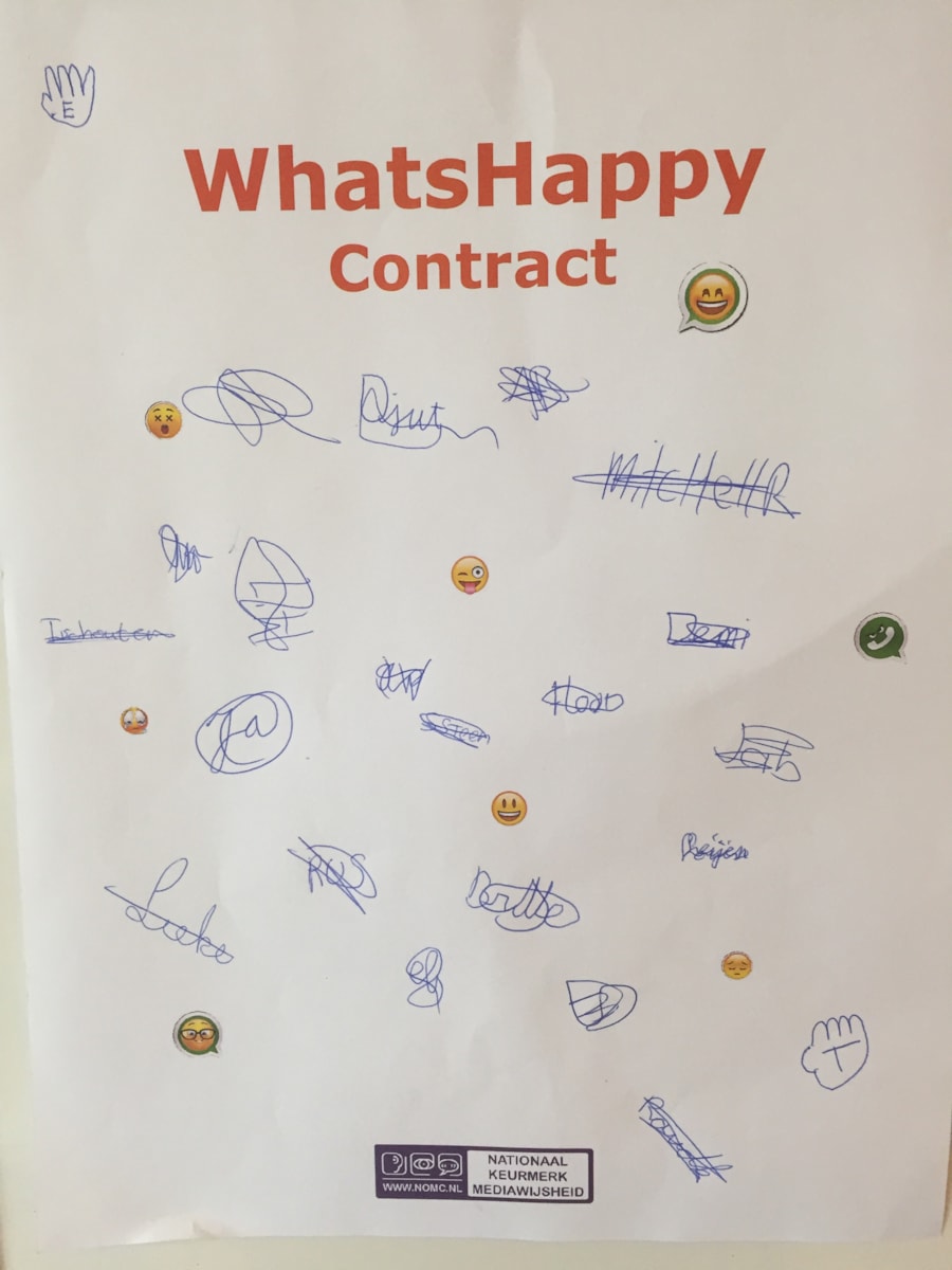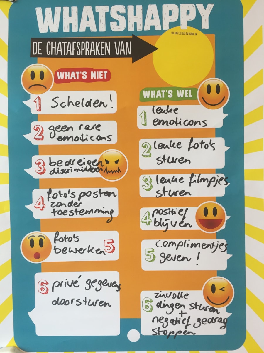 Vervolgens mochten de kinderen in groepjes gaan bedenken wat wel en niet leuk is op Whatsapp en andere chatprogramma’s. Er werd veel bedacht. In veel groepjes kwamen dezelfde ideeën naar voren. Alle ideeën werden met de groep besproken en op de poster geschreven. Tenslotte werd er een contract getekend waarmee de kinderen lieten zien dat zij ervoor zorgen dat ze op een positieve manier om zullen gaan met social media.