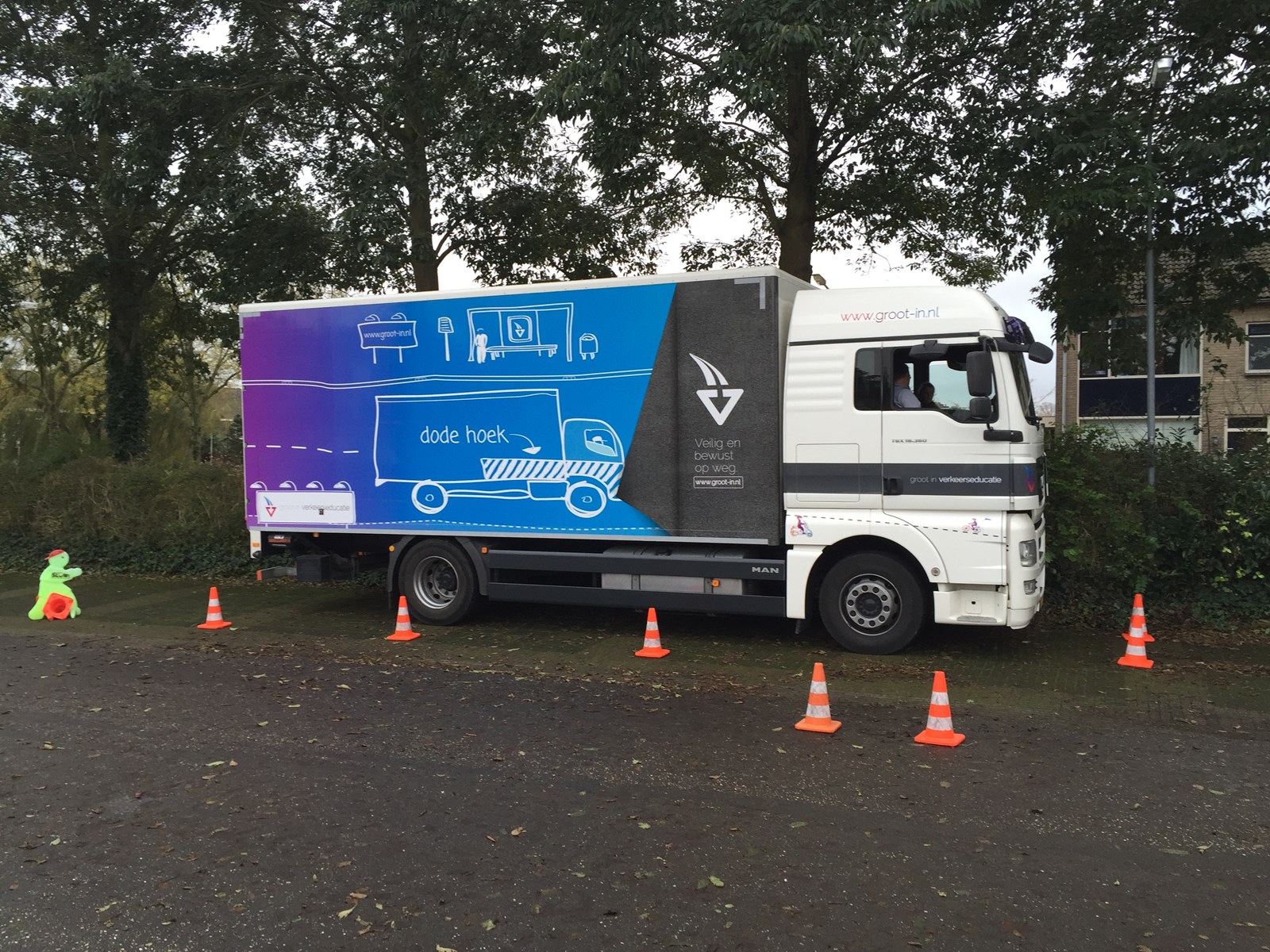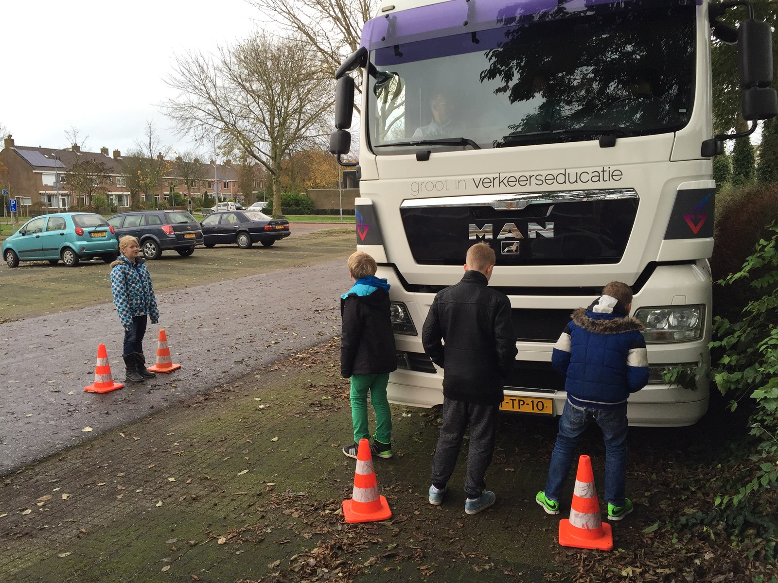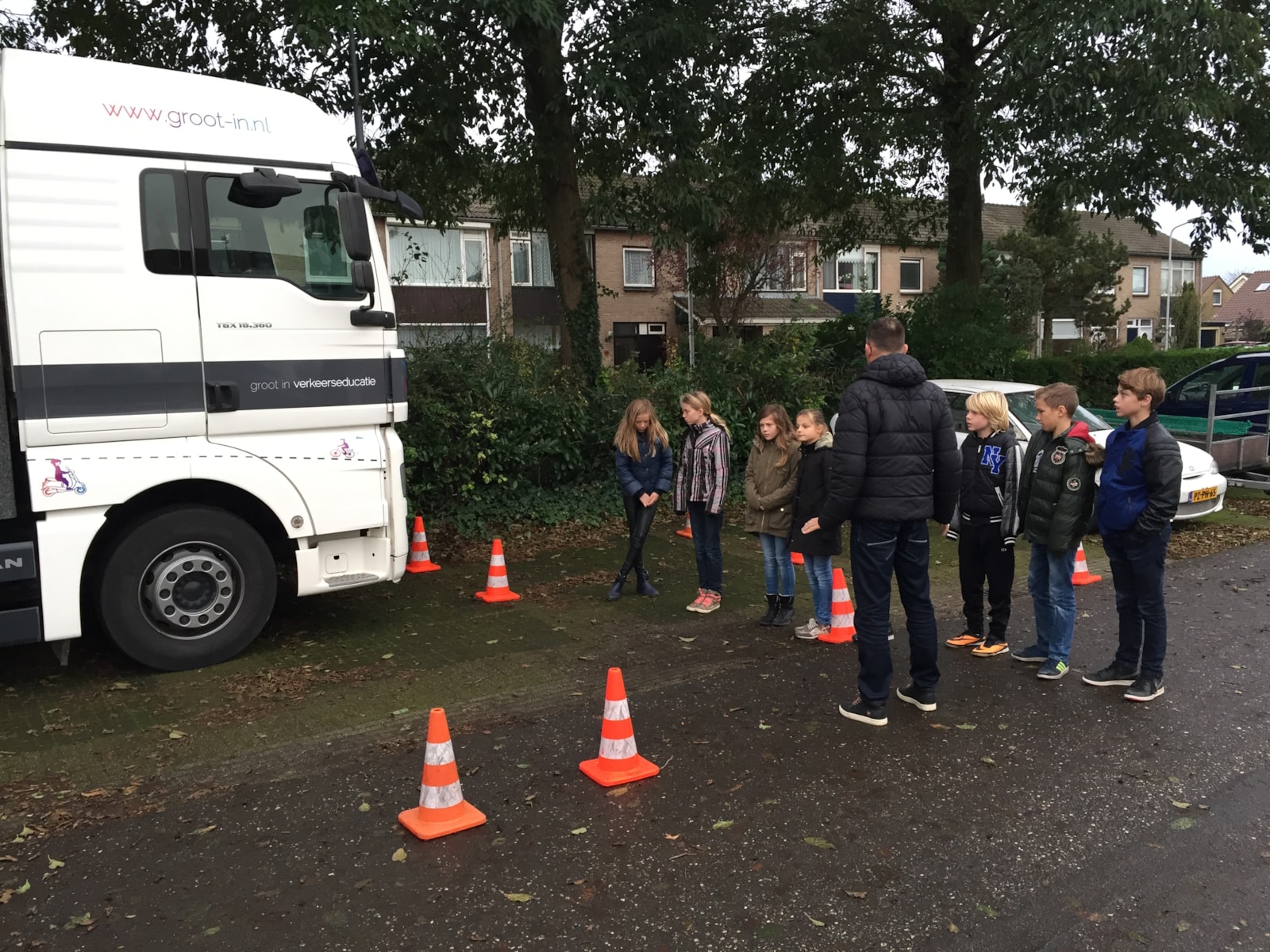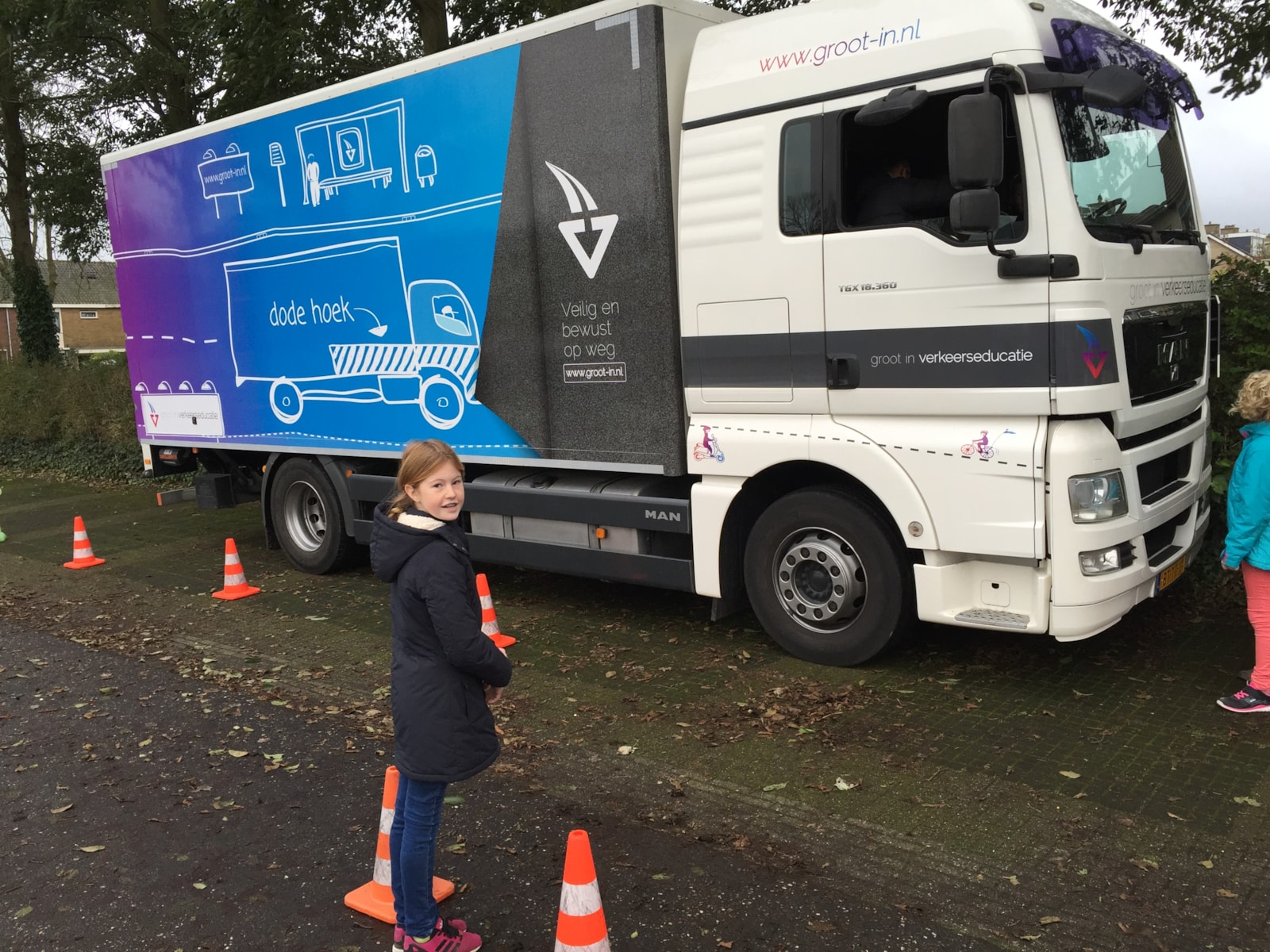 Groep 6, 7 en 8 deden dinsdag mee aan het ”Dode hoek project” van Groot in verkeerseducatie. Alle leerlingen kregen van docent Arjen in de klas uitleg over de dodehoek bij vrachtwagens, bussen en andere grote voertuigen. Eerst werd er een filmpje gekeken en daarna vertelde Arjen. Hij gebruikt veel voorbeelden en stelde vooral heel veel vragen. De kinderen denken vaak “als ik de vrachtwagen of bus zie, dan ziet deze mij ook”. Om de kinderen te laten ervaren dat een chauffeur heel weinig kan zien nam Arjen ze in kleine groepjes mee naar de vrachtwagen die op de parkeersplaats bij De Lelie stond. In alle dode hoeken stonden attributen zoals pionnen, maar ook kinderen! Alle kinderen namen om de beurt plaats op de stoel van de chauffeur. Hierna wisten zij precies wat de chauffeur wel, maar veel belangrijker, niet kan zien. De belangrijkste afspraak is dat je altijd rechts en ruim (minimaal 3 meter) achter een vrachtwagen, bus of landbouwvoertuig moet blijven.