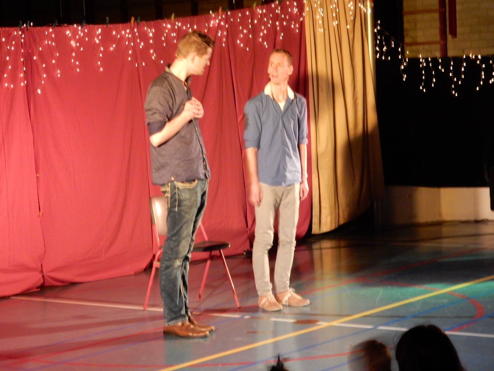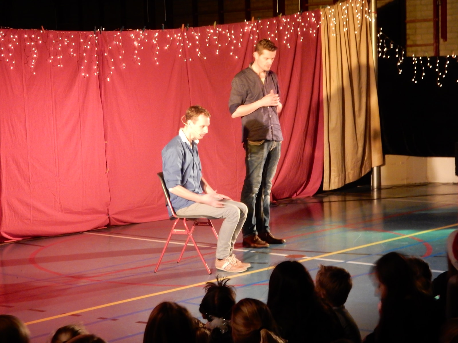 De acteurs die het spel speelden, heetten: Johan en Remi. De voorstelling was in de Lelie, en het was erg interessant. De voorstelling ging over de geboorte van Jezus. Maar eerst kwamen groep 3 en 4 met waxinelichtjes aan lopen. Wij vonden het erg knap dat de acteurs het met zijn tweeën deden. En ze deden ook een spel om het interessant te houden. Dat spelletje was omgekeerde wereld, en iedereen deed lekker enthousiast mee. Het spelletje ging zo: Als Remi zei: ja moesten we nee zeggen. Als hij zij klapten moesten wij stampen. Als hij zei zitten moesten we staan, en zo hebben wij dat een paar minuutjes gedaan. De voorstelling duurde ongeveer een uur, maar in dat uurtje hebben we ons helemaal vermaakt. De voorstelling trok veel ouders en oud-leerlingen aan. Het was een erg grappige en leuke voorstelling. Wij hebben ook geleerd hoe je op verschillende manieren een toneelstukje kan maken zonder voorwerpen. Wij vonden de voorstelling geslaagd.