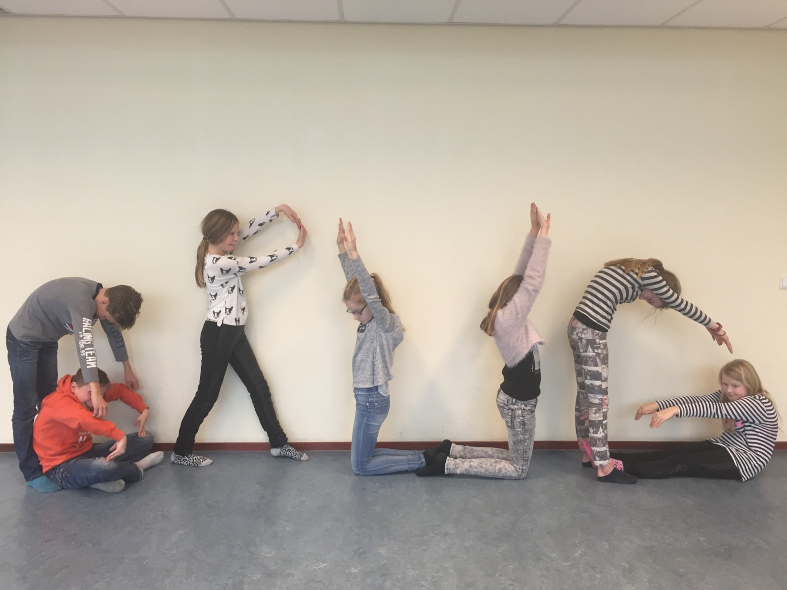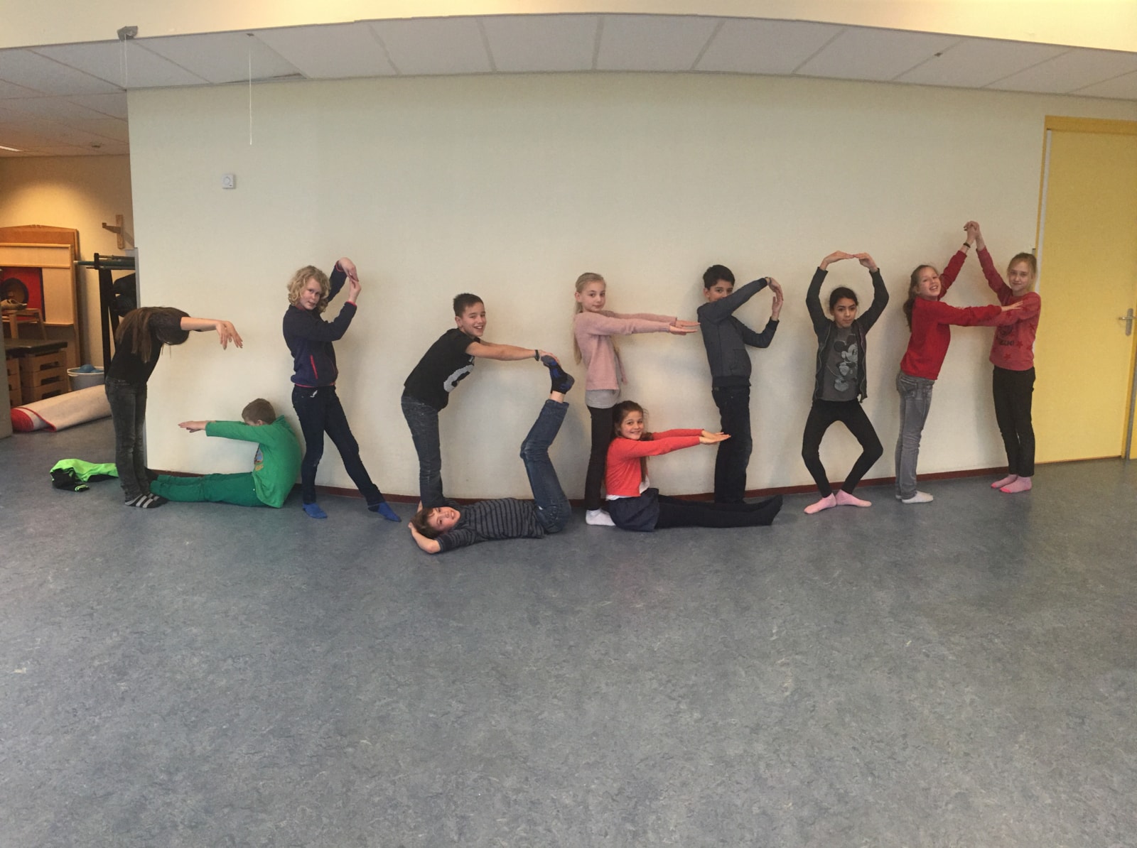 Elke vrijdagmiddag is voor groep 8A een feest! Eerst gymles van juf Moniqe en daarna dramales in de speelzaal. Er wordt van alles geoefend; tableau vivant (levend schilderij), slow-motion, korte toneelstukjes, groepsspellen enz.