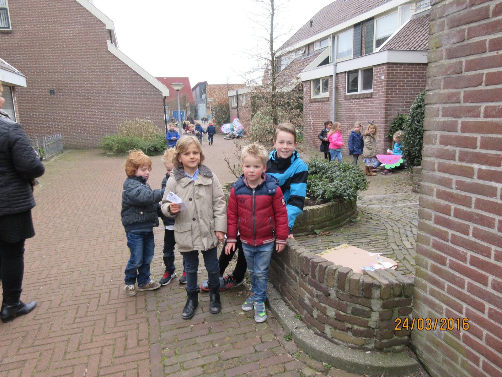 De kleuters speelden na het paasontbijt het paaskippenspel. Dit jaar deden voor het eerst ook de peuters van peuterspeelzaal ’t Bruggetje mee. ’s Middags was het tijd voor groep 3 t/m 7 om het paaskippenspel te spelen. In gemengde groepjes gingen zij op zoek naar de kinderen van groep 8 die als kip verkleed in de omgeving van de school zaten. Foto’s staan op de website onder het kopje ‘activiteiten/paaskippenspel 2016’.