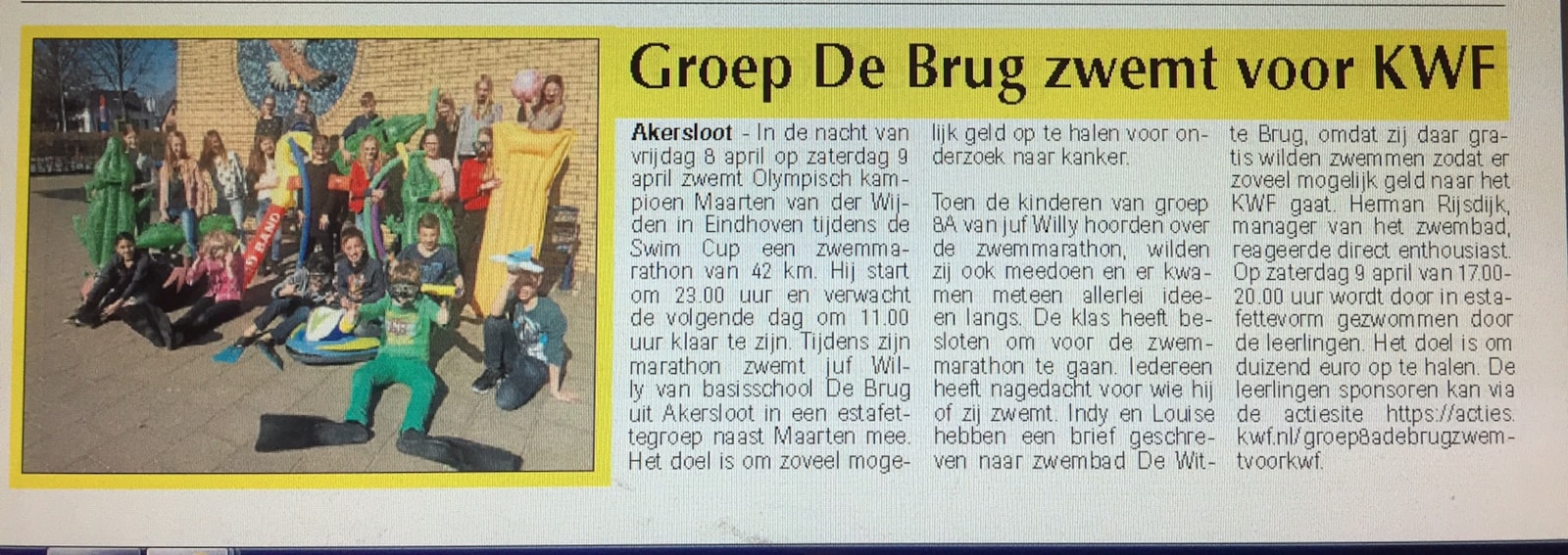 Groep 8a zwemt voor KWF op 9 april in zwembad De Witte Brug. Er wordt gezwommen van 17.00-20.00 uur. De kinderen hadden zichzelf het doel gesteld om €1000,- op te halen. Als snel was dit doel bereikt. De kinderen hebben daarna overlegd en bekeken welke kinderen nog langs welke straten in Akersloot zouden gaan. Daarna werd het doel bijgesteld naar €1750,-. Vandaag is ook dit doel bereikt! De kinderen zijn nog niet klaar met de actie en hebben daarom het doel opnieuw bijgesteld, nu naar €2000,-.
