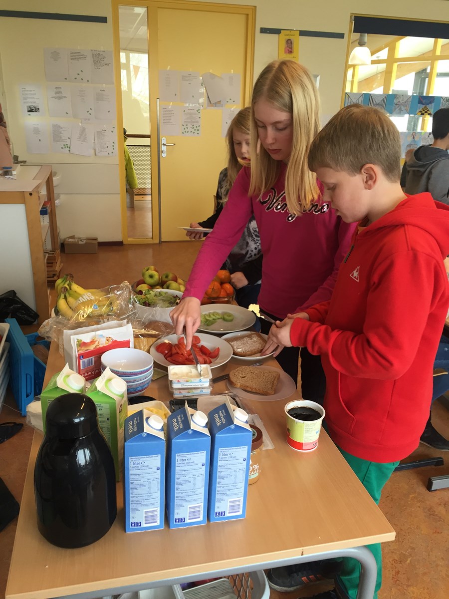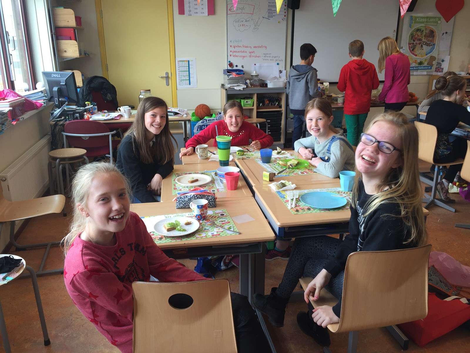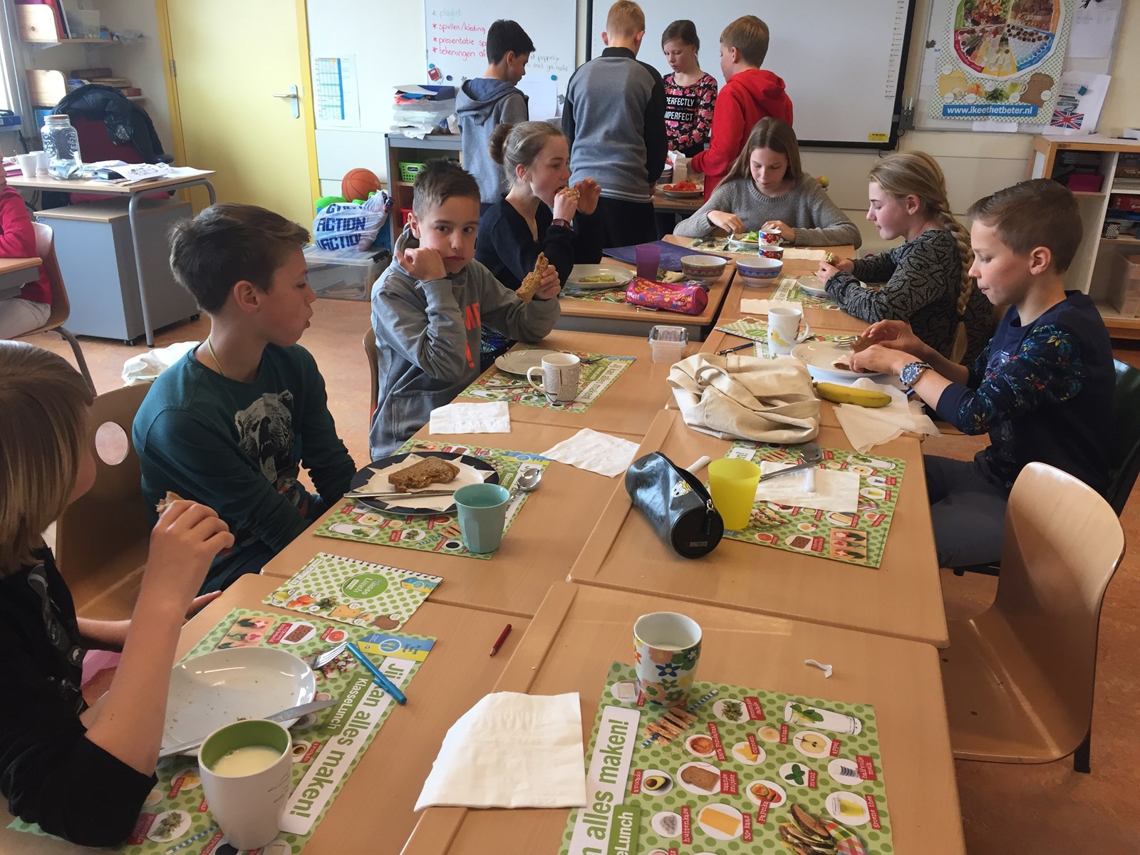 Donderdag was de Klasselunch in groep 8. Van het project ”Ik eet het beter” hadden we boekjes, placemats en filmpjes gekregen over de Schijf van 5 en gezonde voeding en vooral gezonde keuzes. Bij AH Limmen was een groot boodschappenpakket met gezond lekkers opgehaald. Samen hebben we heel gezellig en gezond geluncht.