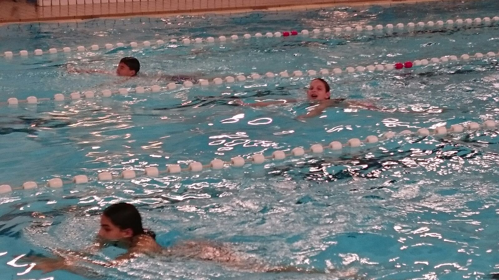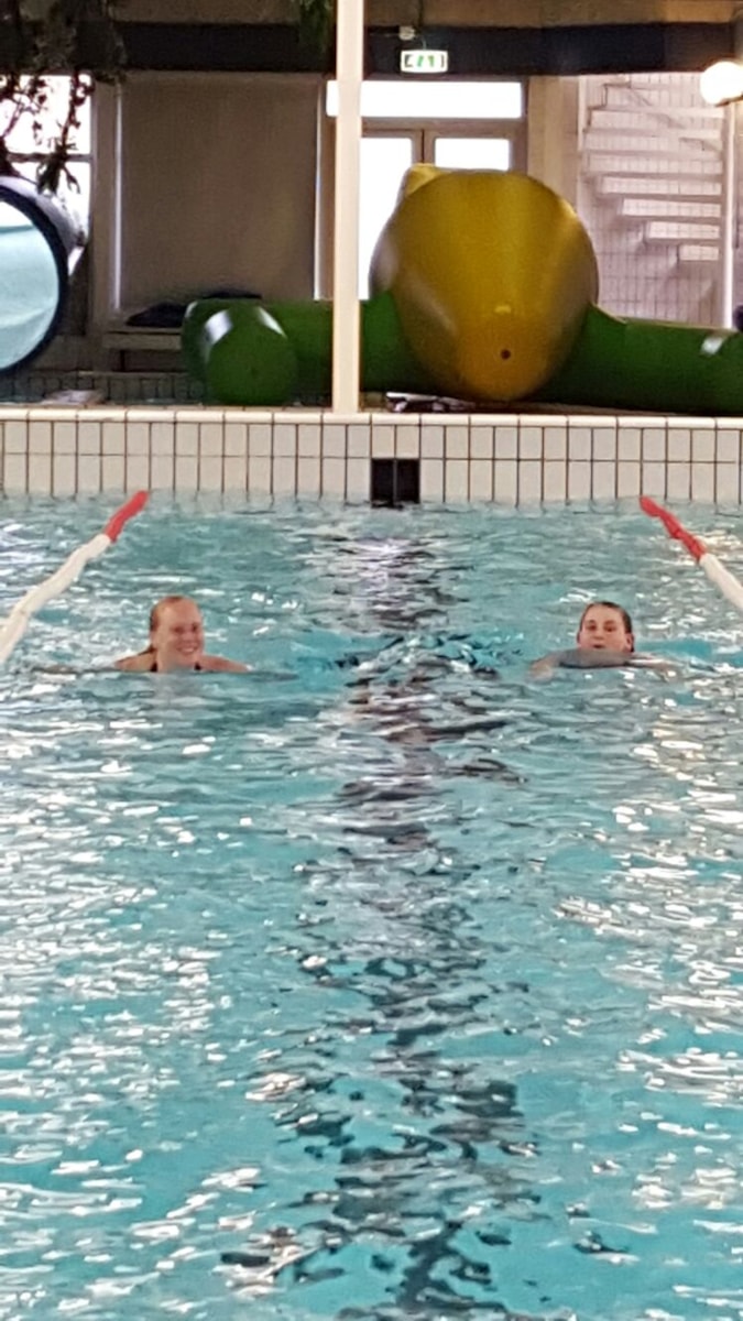Al snel bleek dat het best zwaar was. Sommige kinderen kregen hulp van klasgenoten die wat baantjes extra konden zwemmen. Na ongeveer 1,5 uur gingen ook veel kinderen samen in een baan zwemmen om wat steun aan elkaar te hebben. Van de ouders en andere familieleden die in het zwembad aanwezig waren kregen we flink wat steun.