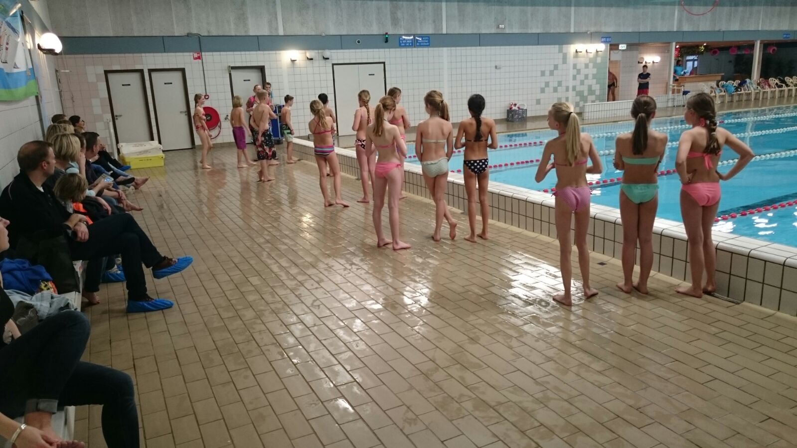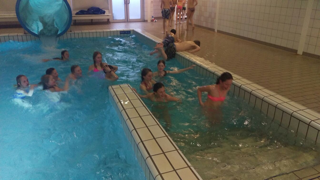 Vlak voor 17 uur stonden alle kinderen klaar bij de zwembadrand. Hun favoriete muziek ging aan en ze gingen van start. Iedereen zwom 3 banen heen en weer en daarna werd er gewisseld. Tussendoor werden en duik en balspelletjes gedaan in het andere bad.