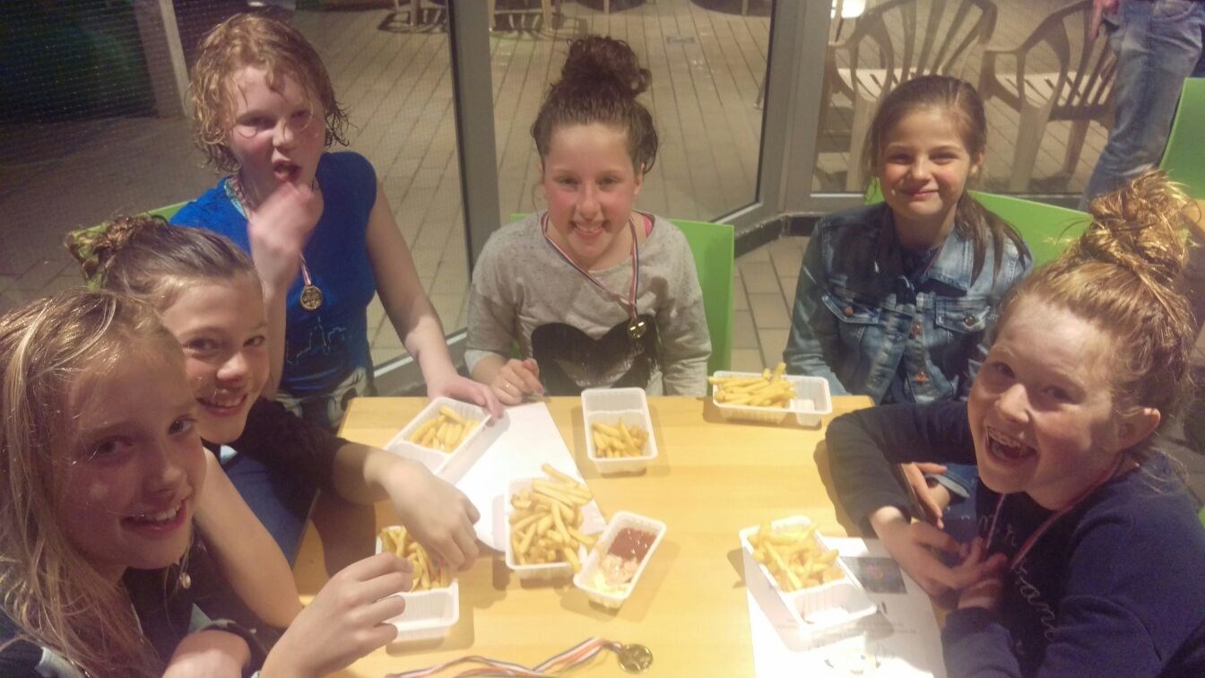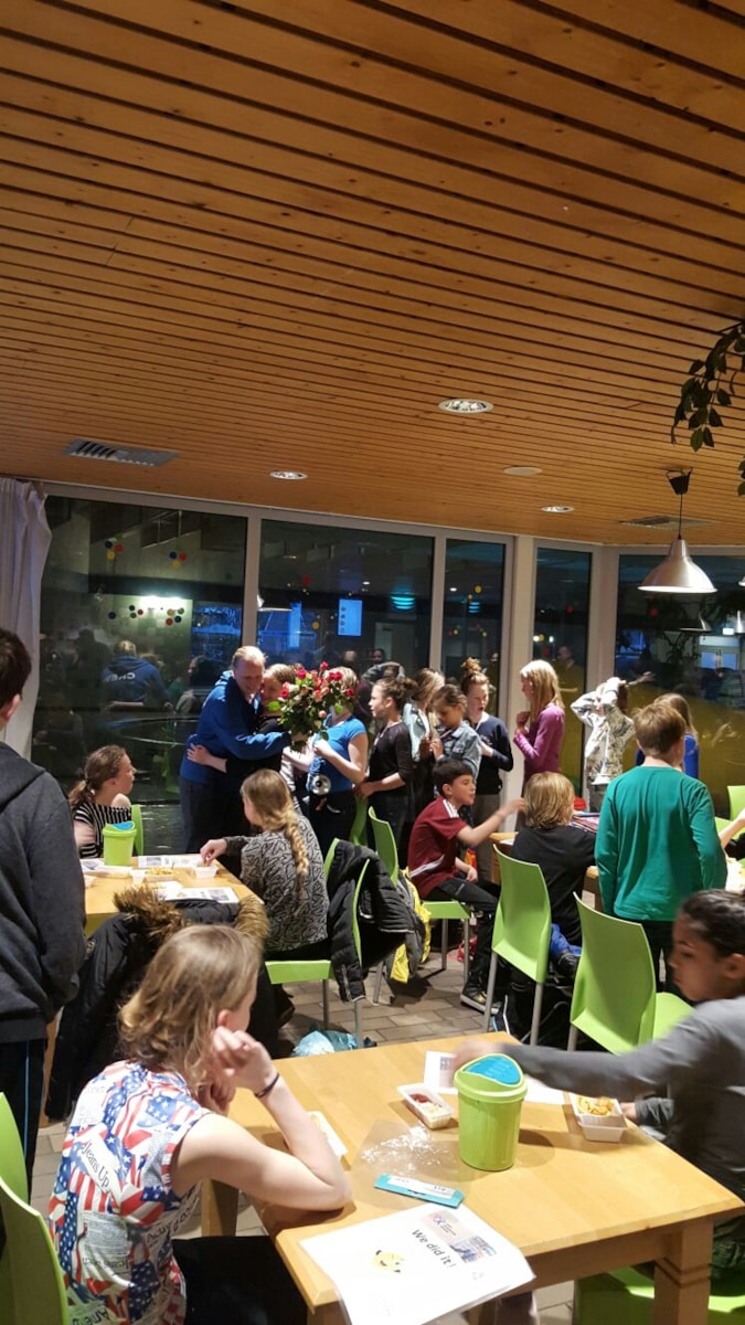 Na het omkleden stond er een patatje voor de kinderen klaar. Dik verdiend na zo’n enorme prestatie! Ik ben ongelooflijk trots op de kinderen. Wat zij gepresteerd hebben is buitengewoon. Zij stonden voor elkaar klaar. Ze hebben een enorme bijdrage geleverd voor onderzoek naar kanker. Ze hebben laten zien wat teamwork is en vooral dat je samen het verschil kunt maken. Ik was (en zeker niet alleen door vermoeidheid) tot tranen geroerd door deze prestatie en de manier waarop we dit project samen gedaan hebben. Ik werd overladen met knuffels door de kinderen. Trots is veel te zacht uitgedrukt voor deze prestatie. Voor mij is dit onvergetelijk!
