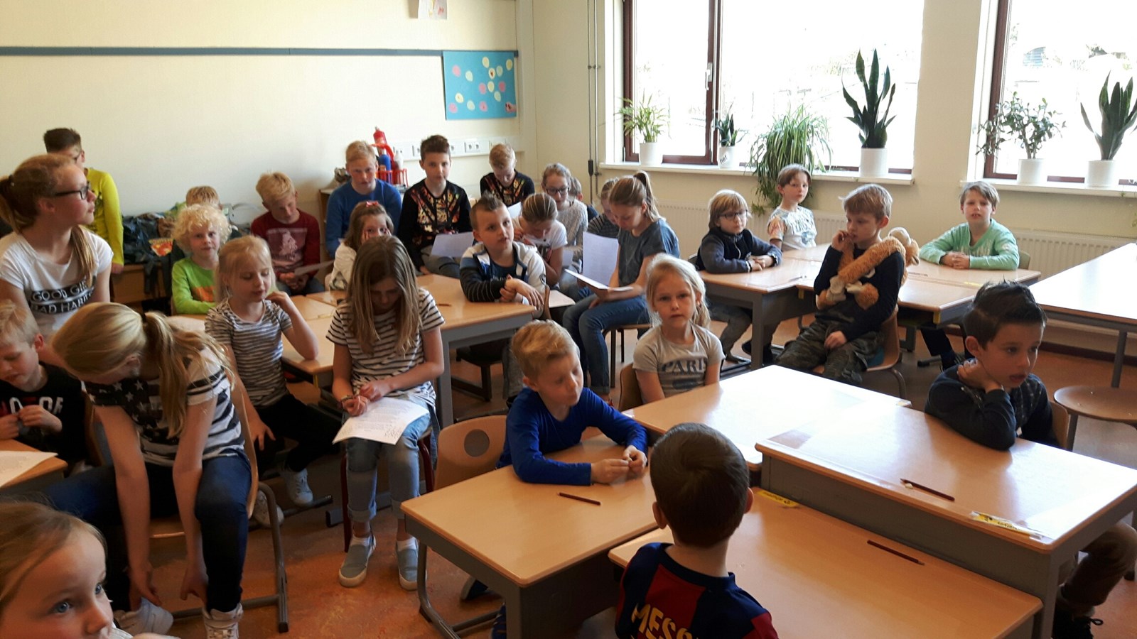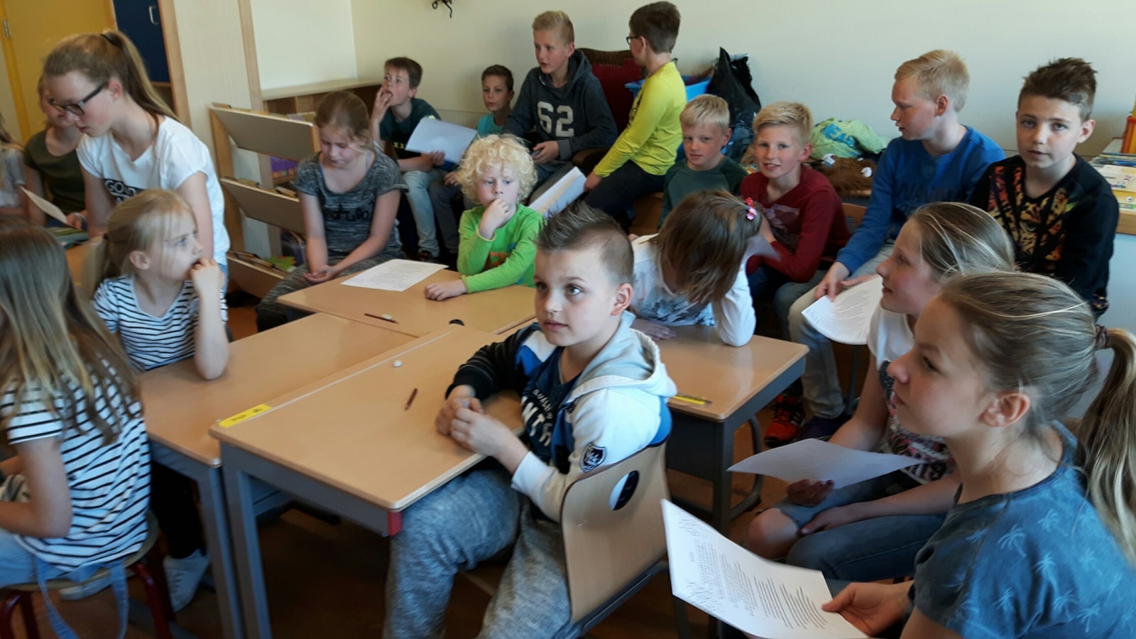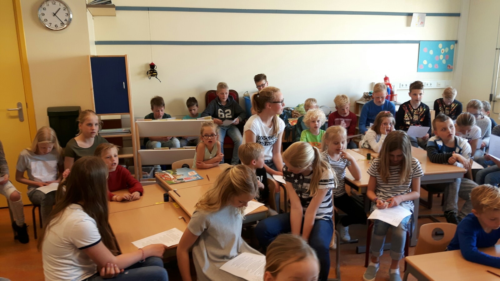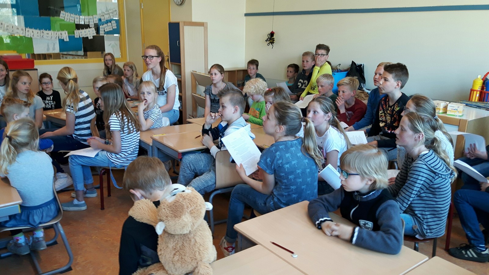 Groep 3 leert een lied aan groep 8b!