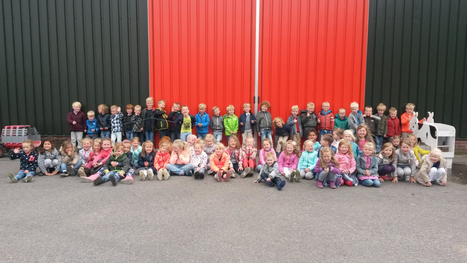 Dinsdag 24 mei was het weer zover, op bezoek naar de boerderij. Met 64 kinderen, 3 juffen, moeders en 1 opa vertrokken wij om 13.15 uur van school. Een korte wandeling naar de boerderij van Wendy, de moeder van Dylan. Dylan en zijn broertje Nick stonden ons al op te wachten. Eenmaal aangekomen werd de groep in drieën verdeeld. Er was een groepje dat mee mocht met Linda (de tante van Dylan) en een groepje ging mee met Wendy, deze groepen gingen de stallen in. Daar leerden we heel veel; over waar de koeien slapen, waar de koeien gemolken worden, over de melkmachine, over hoeveel keer de koeien per dag gemolken worden. Ook mochten we bij de kalfjes kijken, sommige kalfjes zitten alleen in een hokje, dat is een soort wiegje voor kalfjes. De wat oudere kalfjes zitten in een iets groter hokje. Er was ook 1 stier.