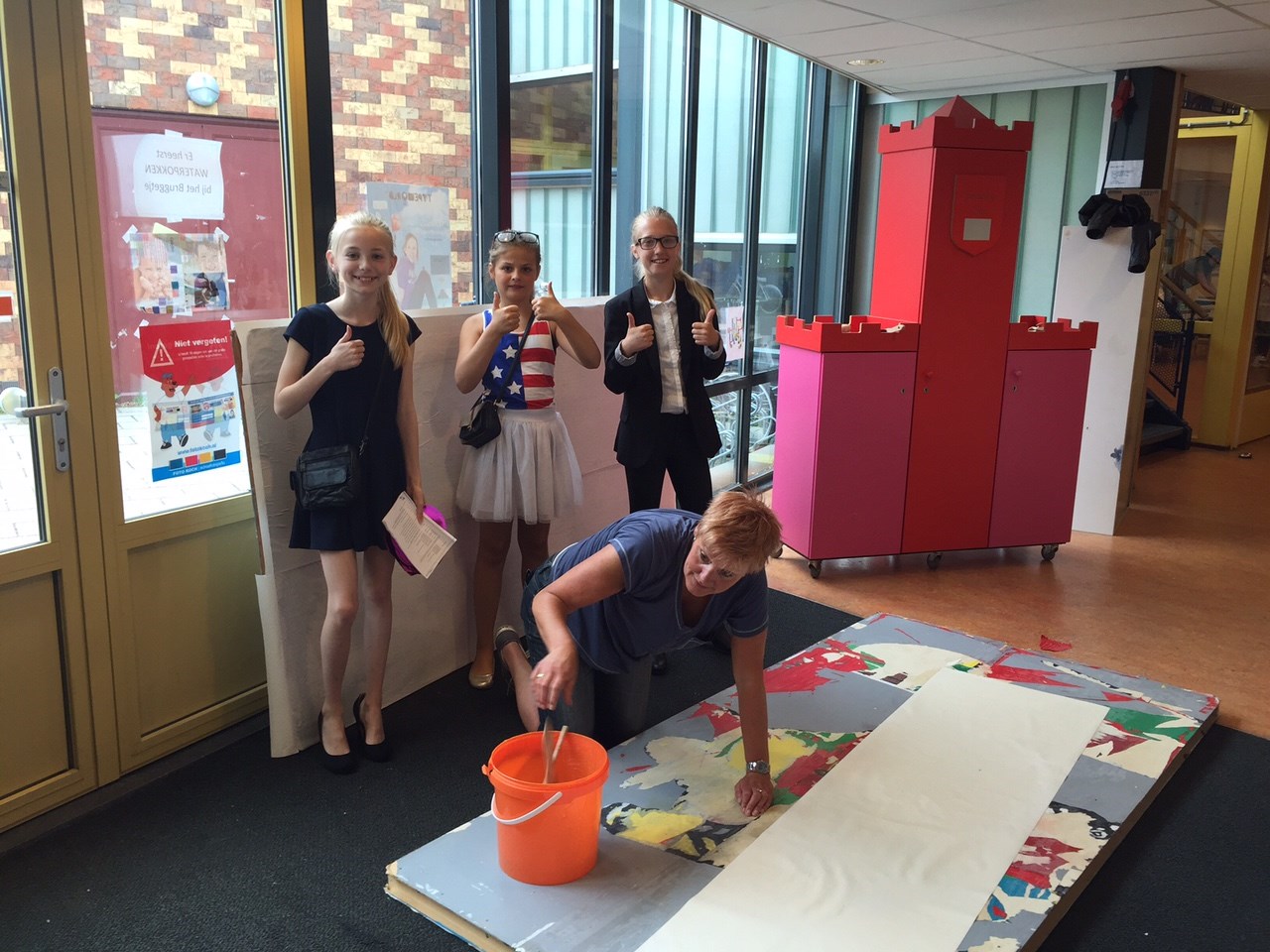 Elke dag oefenen beide groepen in De Lelie. De achterwand van het decor moest behangen en geschilderd worden. Wat zijn wij blij met de hulp van ouders! Het behang zit er perfect op en ook het schilderen is afgerond. Bedankt!