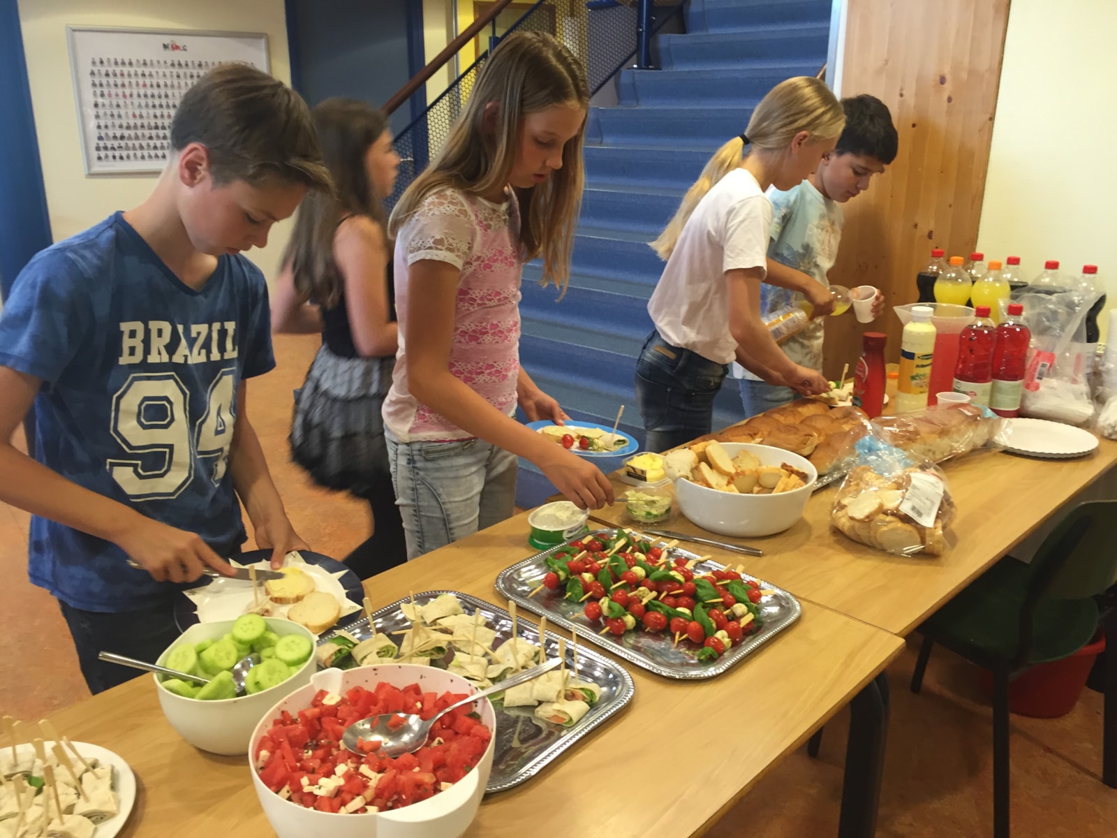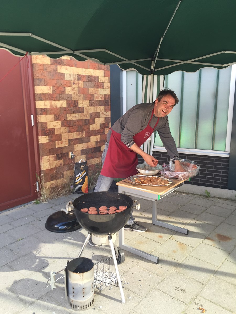 Tienen, vader van Didier. Dit lekkers was voor het diner van die avond. Er werd gehakt gekruid, kip gemarineerd en gesneden en er werden wraps met kip en zalm, een salade met watermloen en feta, spiesjes met tomaat/basilicum en mozzarella en een fruitsalade gemaakt. Serge zette de barbeque om 17.30 uur aan en om 18.00 uur kwamen de kinderen met hun slaapspullen naar school. Alle tafels en stoelen waren ’s middags al uit de klas gehaald dus konden we luchtbedden opgepompt worden en de slaapzakken werden uitgerold.