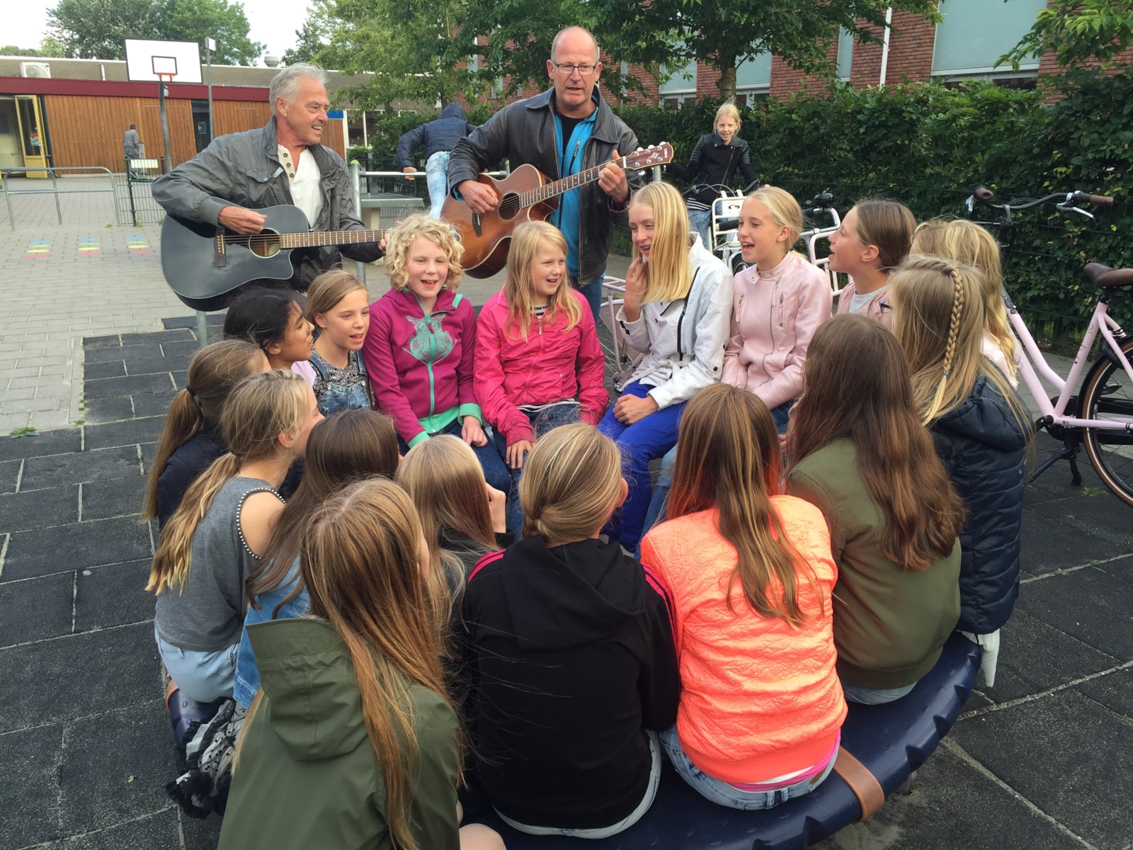 Toen de bedden opgemaakt waren hebben we samen in de hal gegeten. Wat was dat smullen! Na het eten en de afwas hebben we eerst nog buiten gespeeld. Meester Wouter en meester John kwamen met hun gitaar erbij zodat we nog even lekker konden zingen in de zon.