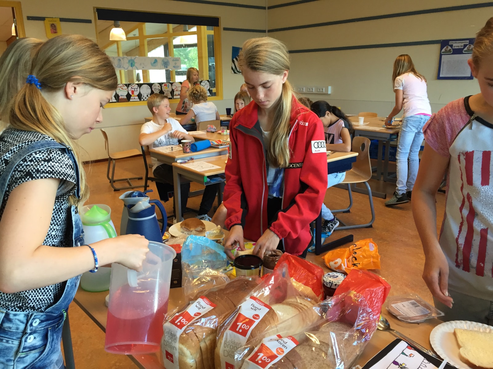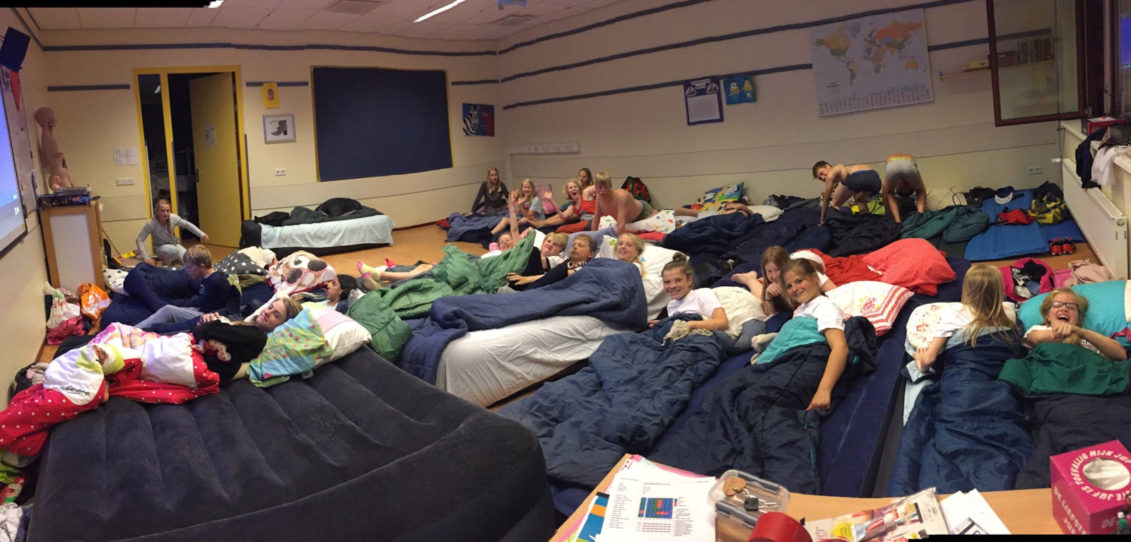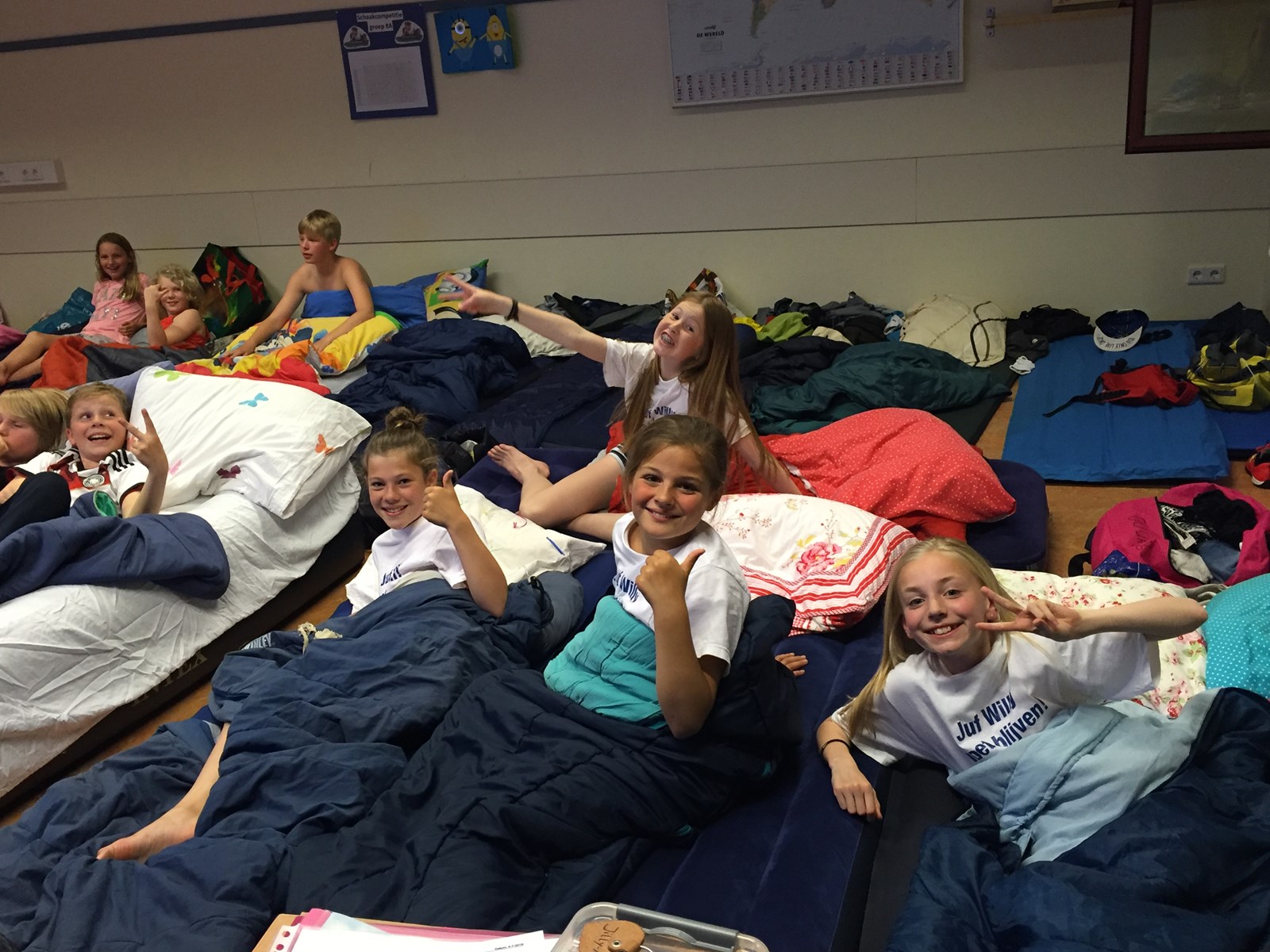 Na de chips en limonade werden de tanden gepoest en gingen we vanuit ons bed film kijken. Na de film was het de hoogste tijd om te gaan slapen. ’s Morgens hebben we samen ontbeten in de klas.