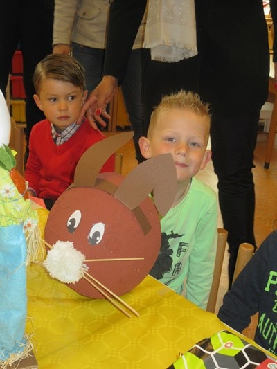 De kleuters speelden na het paasontbijt het paaskippenspel. Ook kwamen de kinderen van het Bruggetje even langs om te kijken naar alle prachtige kippen. ’s Middags was het tijd voor groep 3 t/m 7 om het paaskippenspel te spelen. In gemengde groepjes gingen zij op zoek naar de kinderen van groep 8 die als kip verkleed in de omgeving van de school zaten. Foto’s staan op de website onder het kopje ‘activiteiten’.