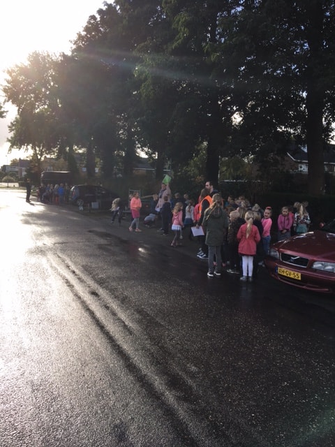 De ontruiming is snel verlopen. Binnen 3 minuten was iedereen buiten! Een tip voor de volgende keer is dat alle groepen een stoplichtkaart bij zich hebben om met de groene kant aan te geven dat de groep compleet is op de verzamelplaats. De rode kant geeft aan dat er een kind mist of een kind ’teveel’ bij de groep staat.