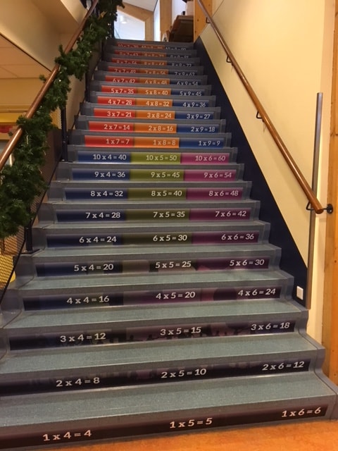 Deze week zijn er trapstickers geplaatst op de trap in de hal. Bij het naar boven lopen kunnen de tafels geoefend worden We zien dat de kinderen dit al automatisch doen!