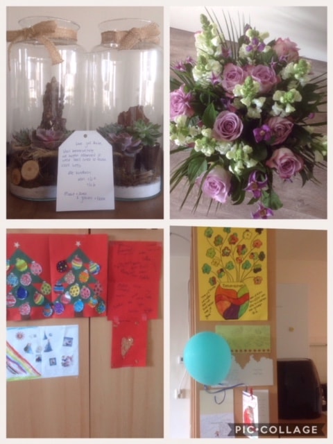 14 december heb ik een nieuwe knie gekregen! Ik heb 2 nachten in het ziekenhuis geslapen en daarna ging ik voor ruim een week naar mijn zus Ellen en zwager Jan. Dat was heel fijn. In het begin kan je niet eens je been optillen om uit bed te komen. Dus anderen moeten je been ondersteunen om deze op de grond te krijgen. Dat gaat nu al veel beter. De directrice Karin kwam hier even op ziekenbezoek. Nadat ik weer thuis was kwamen juf Angelique en juf Joka in de kerstvakantie op ziekenbezoek. Ze hadden kaartjes en cadeautjes mee van kleuters en hun ouders. Van 1/2 A en 1/2 B kreeg ik hele mooie groepswerkjes. Zelfs van groep 6 kreeg ik beterschapswensen op een blad met alle namen van de kinderen. Ik kreeg een kaart van de Peuteropvang en de BSO. Op een middag kwamen Marit, de moeder van Zara en Jorien, de moeder van Floor, 2 hele mooie glazen vazen brengen met een tuintje erin. Van groep 1/2 A en groep 1/2 B. Ook kreeg ik namens de OR, MR en team de Brug een prachtige bos bloemen. Deze bracht Sylvia, de moeder van Esther. Ik heb regelmatig Whatsapp contact met Angelique en Joka, want ik wil natuurlijk wel op de hoogte blijven. Ook berichtjes van Karin en andere collega’s. Lieve kinderen, ouders en collega’s ik wil jullie bedanken voor alle berichten, kaarten, cadeautjes en bezoekjes. Dat heeft mij veel goed gedaan en maakte mij erg blij. Ik mis ‘mijn’ kleuters, ouders, opa’s en oma’s, waar ik regelmatig gesprekjes mee had. Het heeft nog wel tijd nodig, want zelfs na 4 weken heb ik nog een hele dikke knie. Ik kijk ernaar uit om iedereen weer te zien. Nogmaals dank.