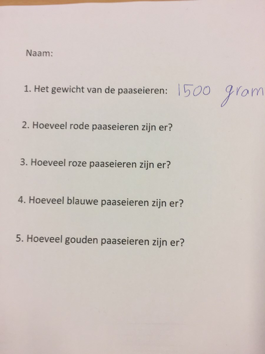 In groep 8 staat een grote pot met paaseitjes. De pot is dicht! En dan is nu de vraag.....Wie raadt het juiste gewicht van de paaseitjes, en de diverse hoeveelheden per kleur? Groep 8 breekt hun hersens erop ! Volgende week woensdag maken we de winnaars bekend!
