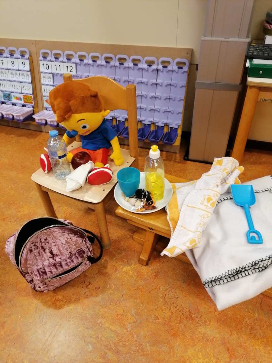 Vandaag ging pompom op taaltocht. Met een rugtas vol spullen ging hij op reis. Een schep om naar de andere kant van de wereld te scheppen, een fles met water voor de dorst en nog veel meer. We hebben besproken waar we alles voor kunnen gebruiken.