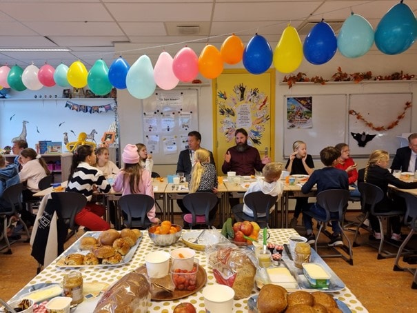 Onze groep 7 at dinsdagochtend 8 oktober hun eerste broodje van de dag samen met de burgemeester en een aantal wethouders.