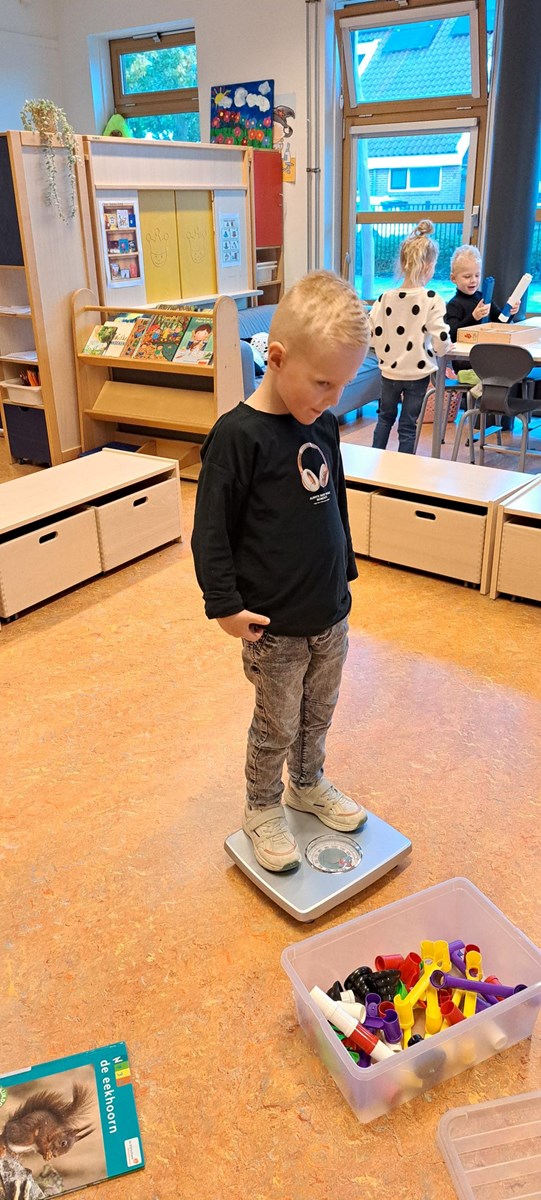 We hebben geleerd over de zwaartekracht, wat is zwaar en wat is licht. Wat valt er als eerste naar beneden. We hebben in de kring onderzocht, door te voelen en uit te proberen. Alles laten vallen en gekeken wat er zwaarder is. We hebben het gewogen op de weegschaal in tweetallen, van alles zoeken in de klas en wegen maar. Ook stond de personenweegschaal in de kring. De kinderen mochten het gewicht met elkaar vergelijken.