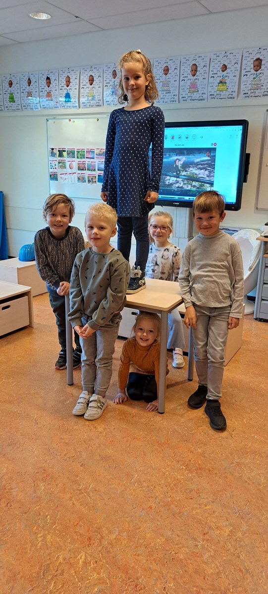 Deze week hebben we de begrippen, op, onder, links/rechts, voor en achter besproken. De kinderen mochten dit laten zien door o.a op de tafel te gaan staan. Ze vonden het geweldig om te doen.