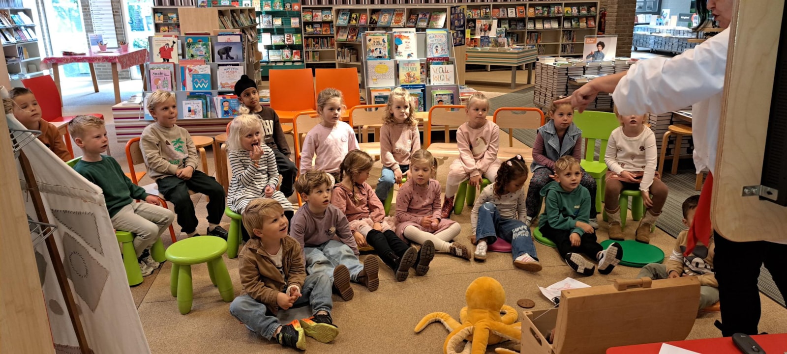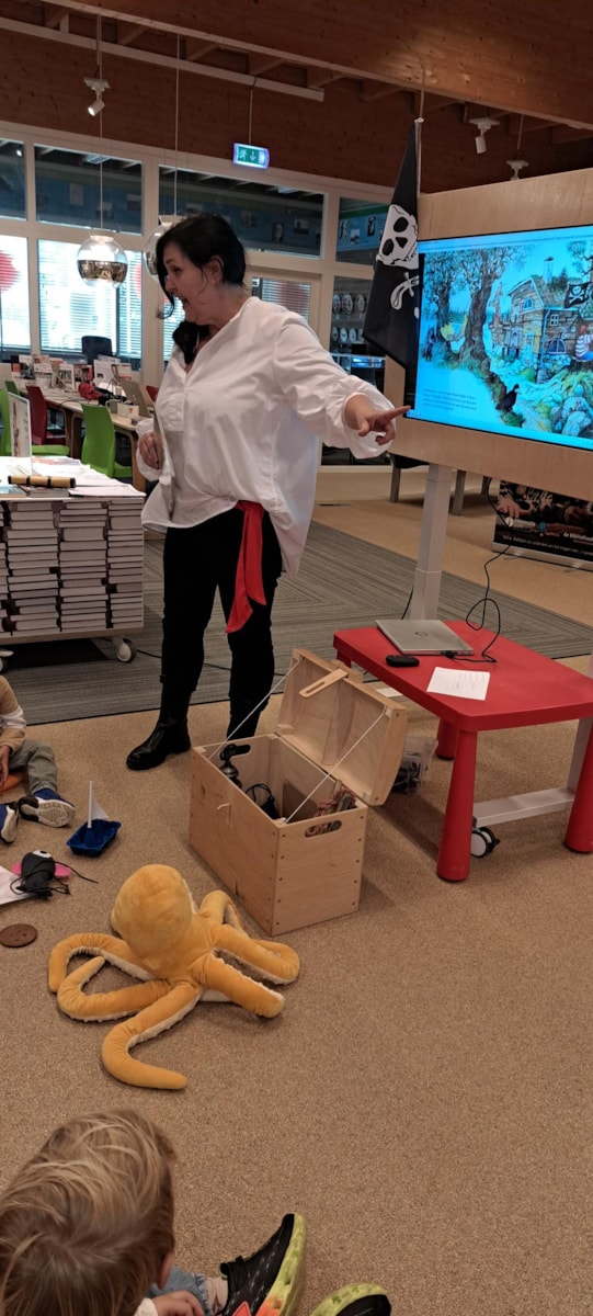 Donder hadden we een activiteit in de bieb, dit in het kader van de kinderboekenweek. In de deuropening stond een piraat, geen echte natuurlijk. Het was juf Erica. Ze vertelde ons het verhaal van Woeste Willem en alle platen konden we zien op het digibord en ze had ook alle attributen uit het boek mee genomen, een vlieger, een schelp, een bootje en een octopus. Tot slot mochten we ook nog luisteren in de schelp naar de zee. Het was weer geweldig en we hebben er allemaal van genoten.