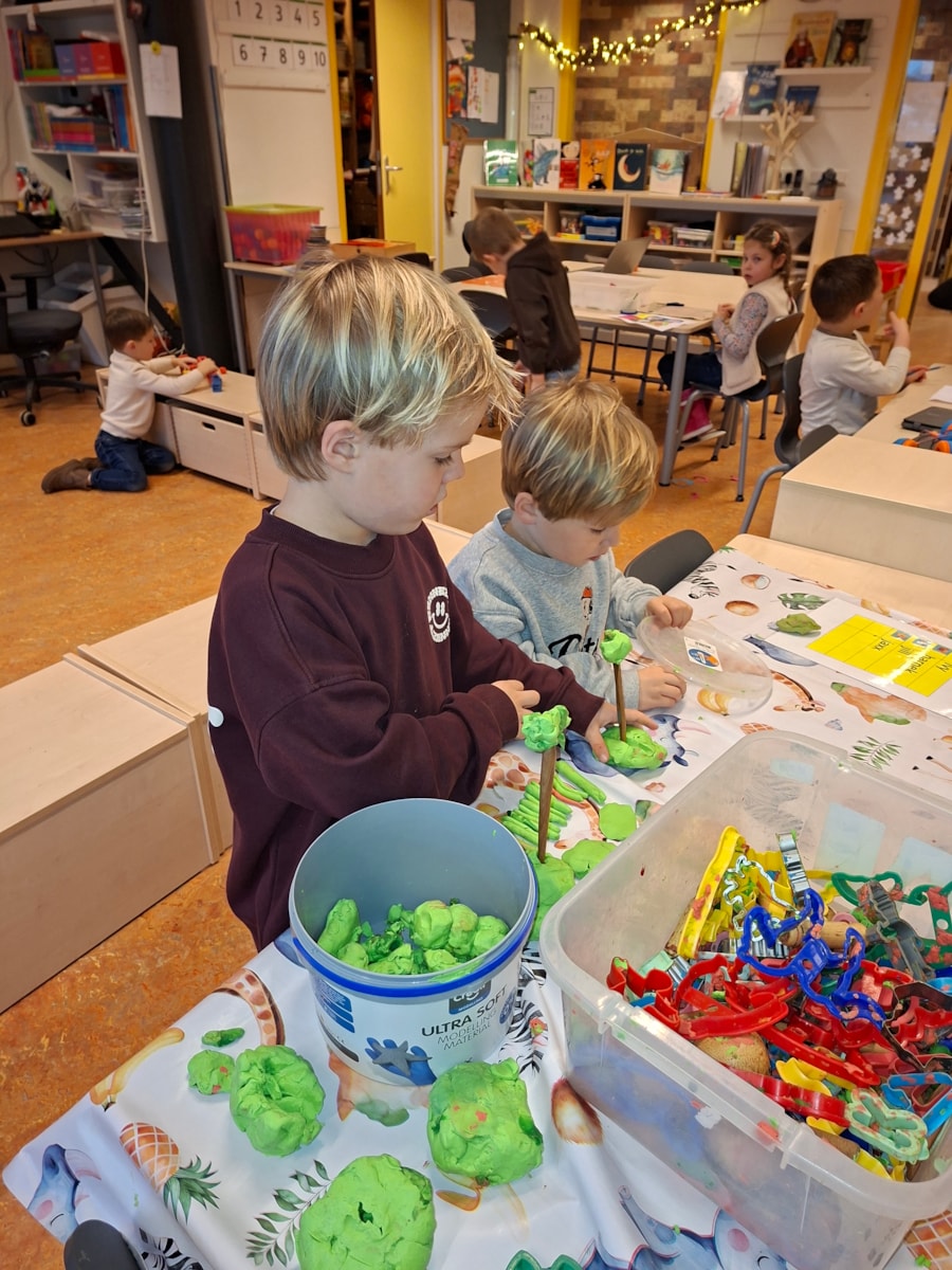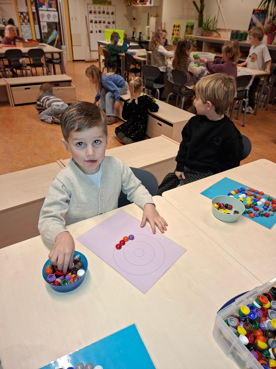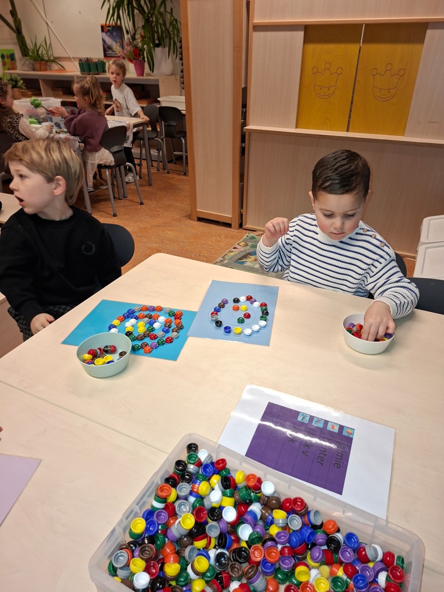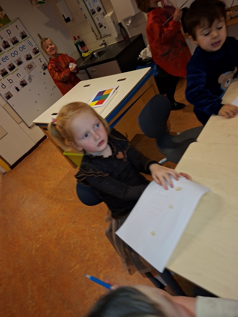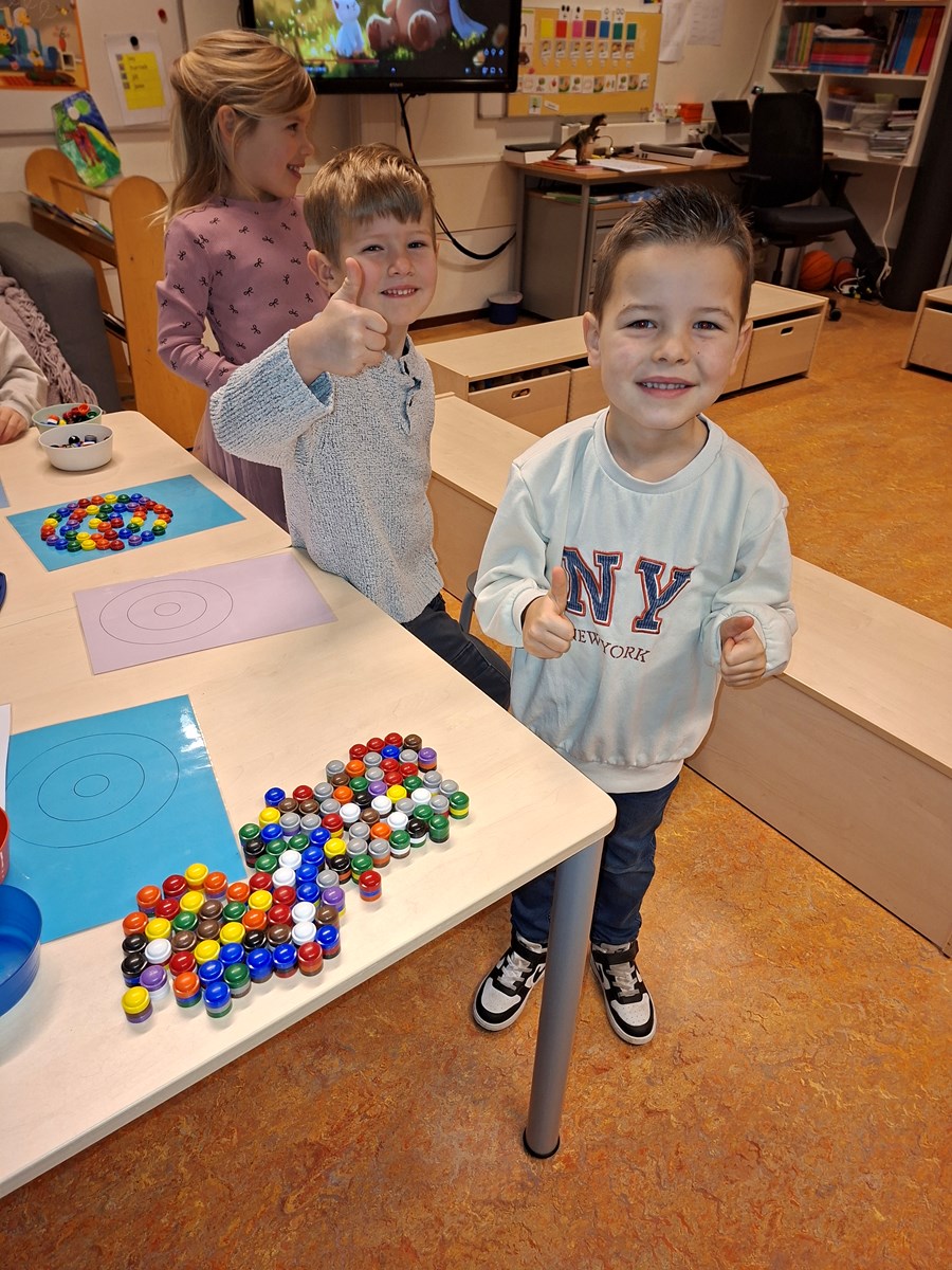 In de klas hebben we ook een bak met zand op de lichttafel. Je kan ook met zand kunstwerken maken. Ook een goede oefening voor de fijn motoriek. Met dopjes hebben we ook ronde kunstwerken gemaakt. Je legt de dopje op de cirkels en er ontstaan een mooi werk. Ook beeldhouwen is aan de orde gekomen. Vorige week waren we zelf nog standbeelden, deze week hebben de kinderen van klei beelden gemaakt.