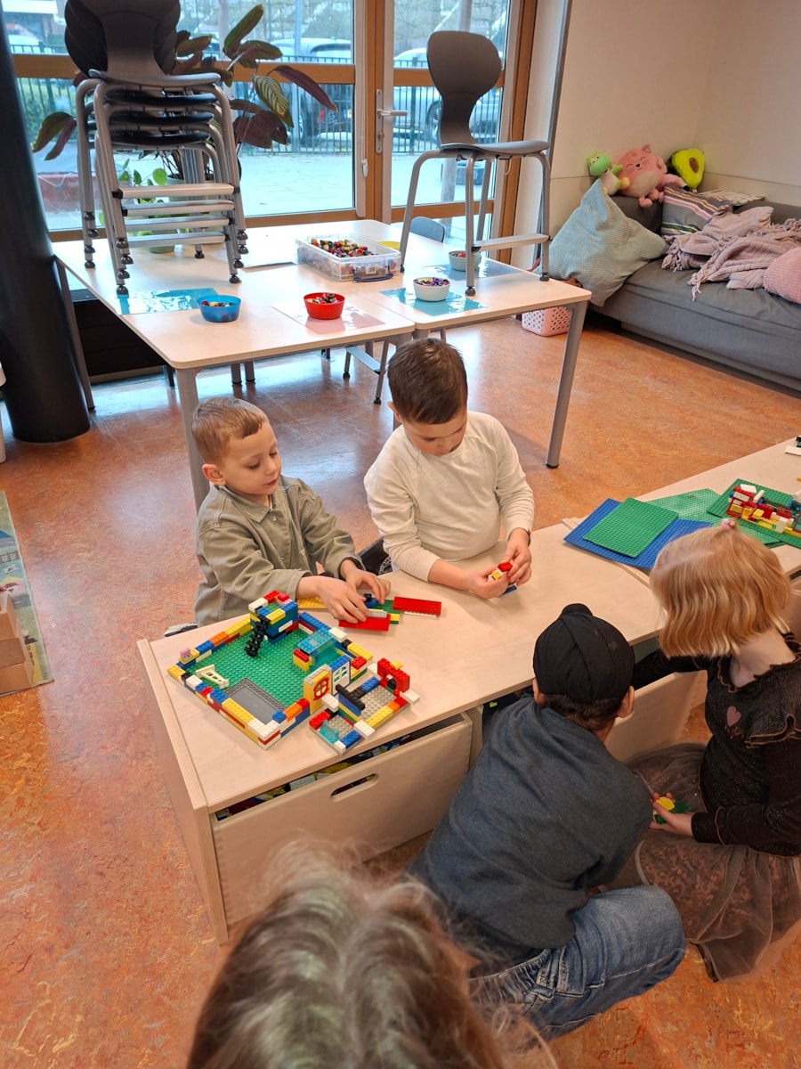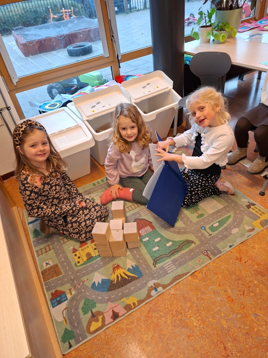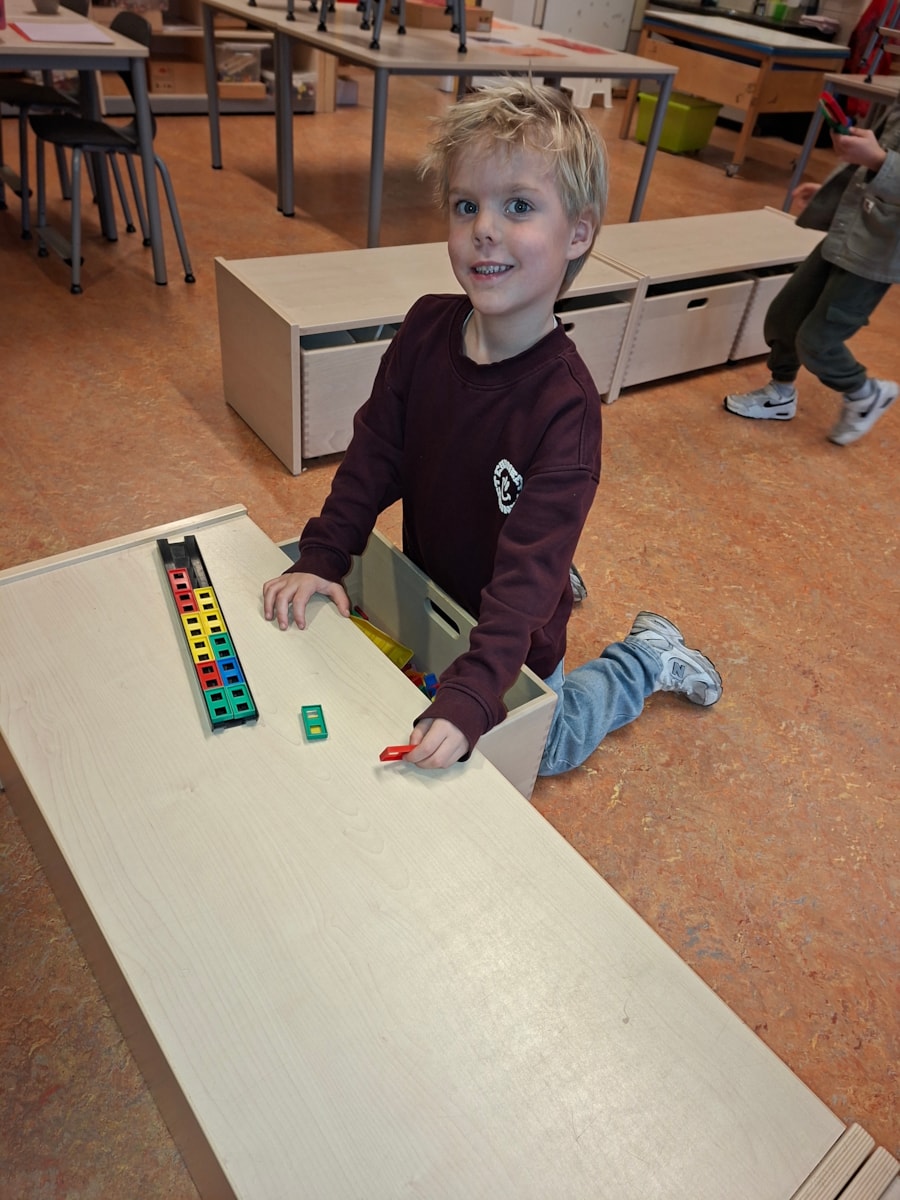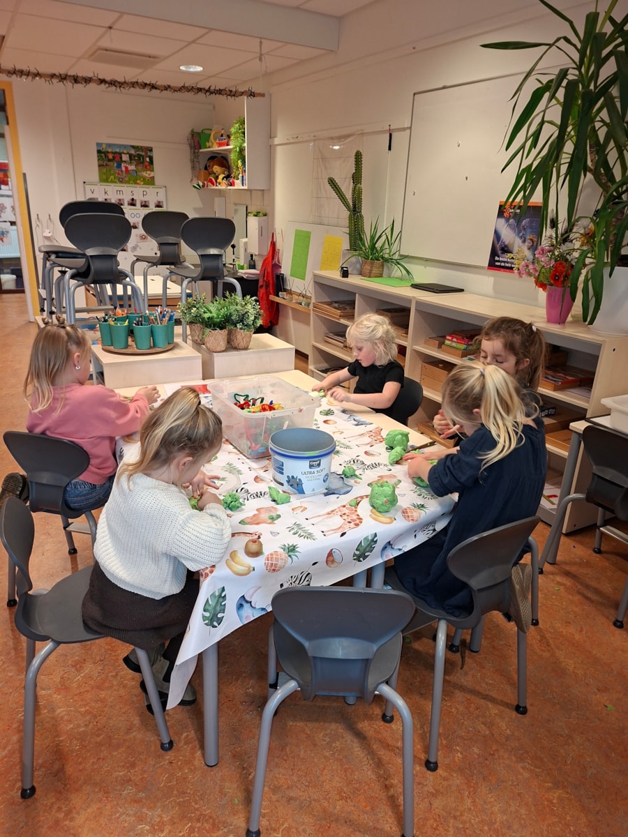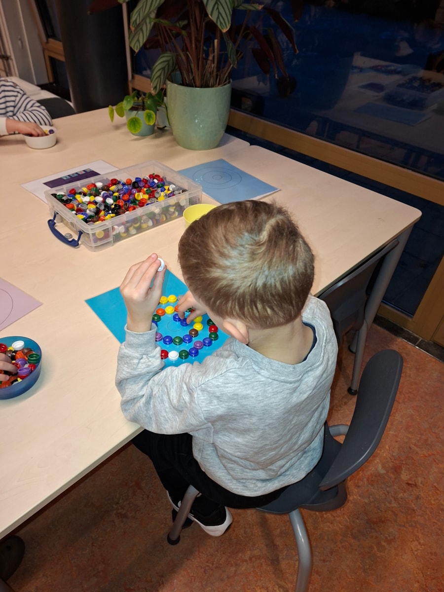 In de klas hebben we ook een bak met zand op de lichttafel. Je kan ook met zand kunstwerken maken. Ook een goede oefening voor de fijn motoriek. Met dopjes hebben we ook ronde kunstwerken gemaakt. Je legt de dopje op de cirkels en er ontstaan een mooi werk. Ook beeldhouwen is aan de orde gekomen. Vorige week waren we zelf nog standbeelden, deze week hebben de kinderen van klei beelden gemaakt.