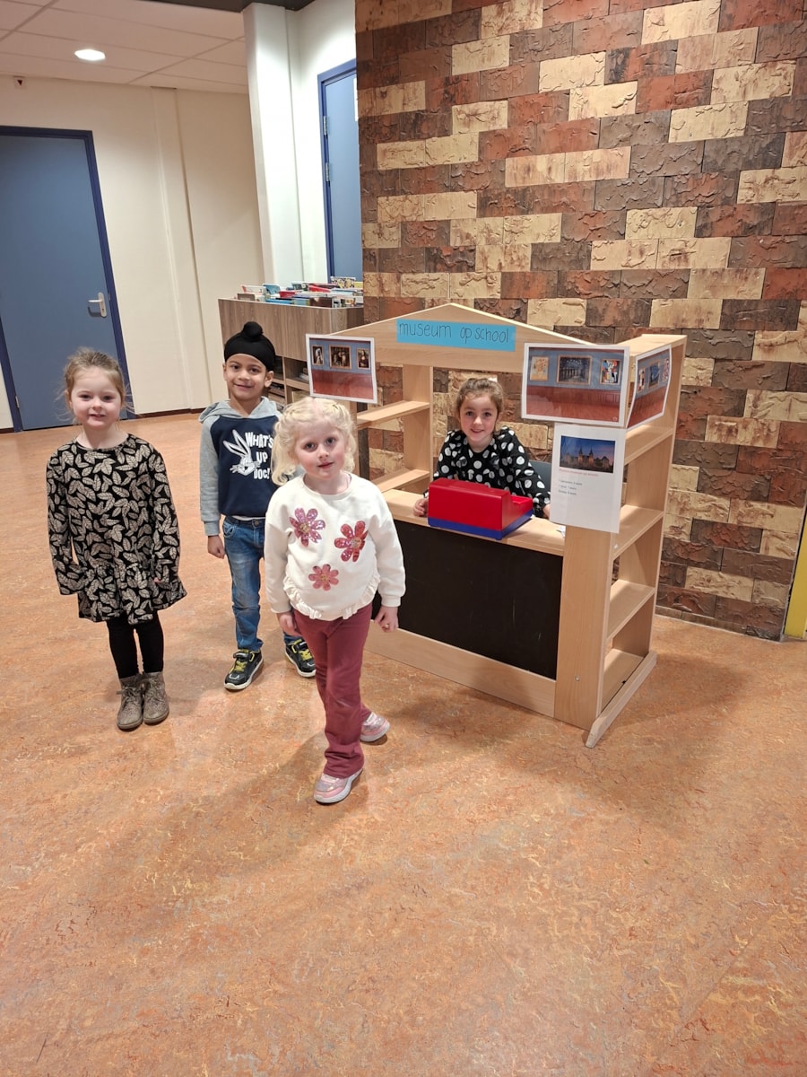 In de gang hebben we een loket gemaakt om tickets te kopen voor het museum. We hebben met elkaar bedacht hoe de het museum wilden noemen. Ook hebben we bedacht wat een ticket Dan zou moeten kosten, betalen volwassen hetzelfde als kinderen en wat gaan ze dan betalen. Ook hebben we tickets gemaakt en verkocht! We hebben ook besproken wat 1 euro is en wat 2 euro is en wat 5 euro is. Soms krijg je ook nog geld terug omdat je teveel hebt betaald. Heel belangrijk was ook hoe je je moet gedragen in een museum, nergens aankomen, kijken met je ogen, rustig lopen en zachtjes praten. Een aantal kinderen konden ook vertellen dat ze al eens naar een museum waren geweest.