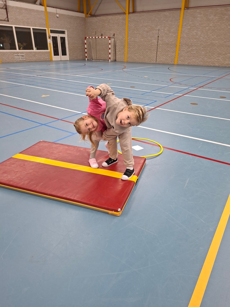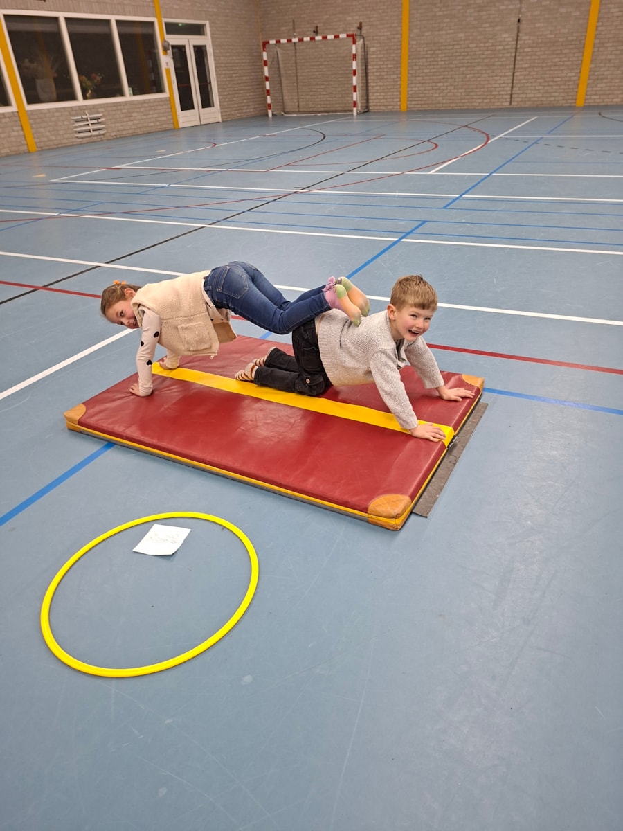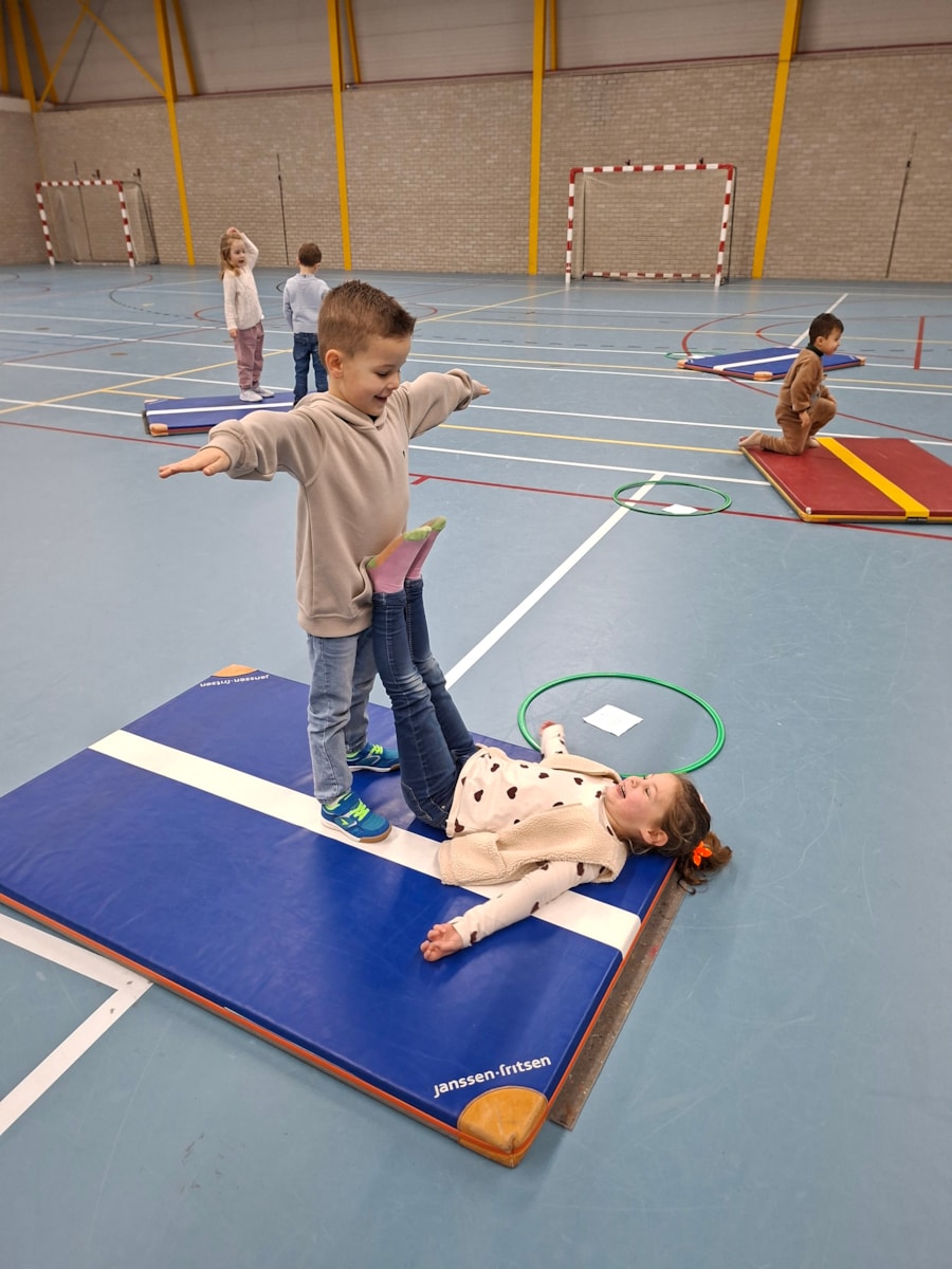 In de gymzaal hadden wij een olifanten tikspel, als olifant met slurf de andere kinderen tikken. We hadden een olifantenvoetbalspel, met de slurf een bal in het doel krijgen en als laatste een spel met de hockey sticks, de bal voortbewegen. Op donderdag waren de kinderen allemaal acrobaten geworden. Iedereen mocht rennen door de gymzaal. Wanneer ik op de trommel sloeg mochten alle kinderen een matje opzoeken. De bedoeling was een jongen met een meisje. Naast het matje lag een afbeelding en deze afbeelding mochten ze nadoen. Wat hebben we ervan genoten, het was zo enorm leuk om te doen. Aan het einde van de gymles moesten we de matjes opruimen, dat was echt teamwork, met z’n allen tillen! Trots ben ik op alle kanjers!