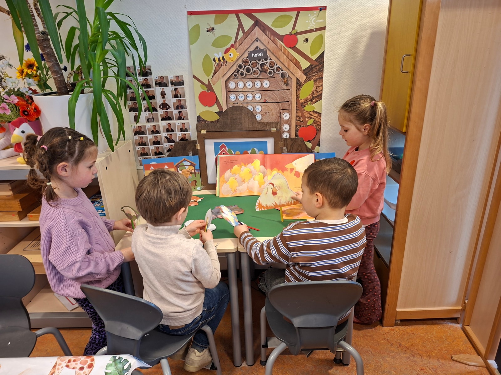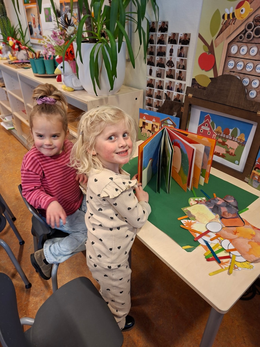 Ook hebben we al wat lente verhalen gehoord. In de klas is een hoek om het verhaal van het boek “Dotties eieren”. Op deze manier herhalen de kinderen het verhaal en spelen het verhaal na.