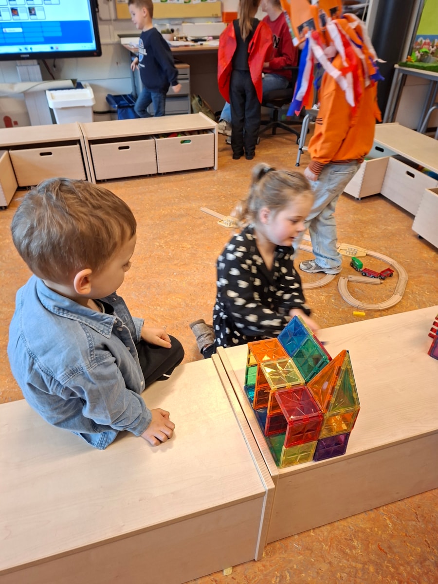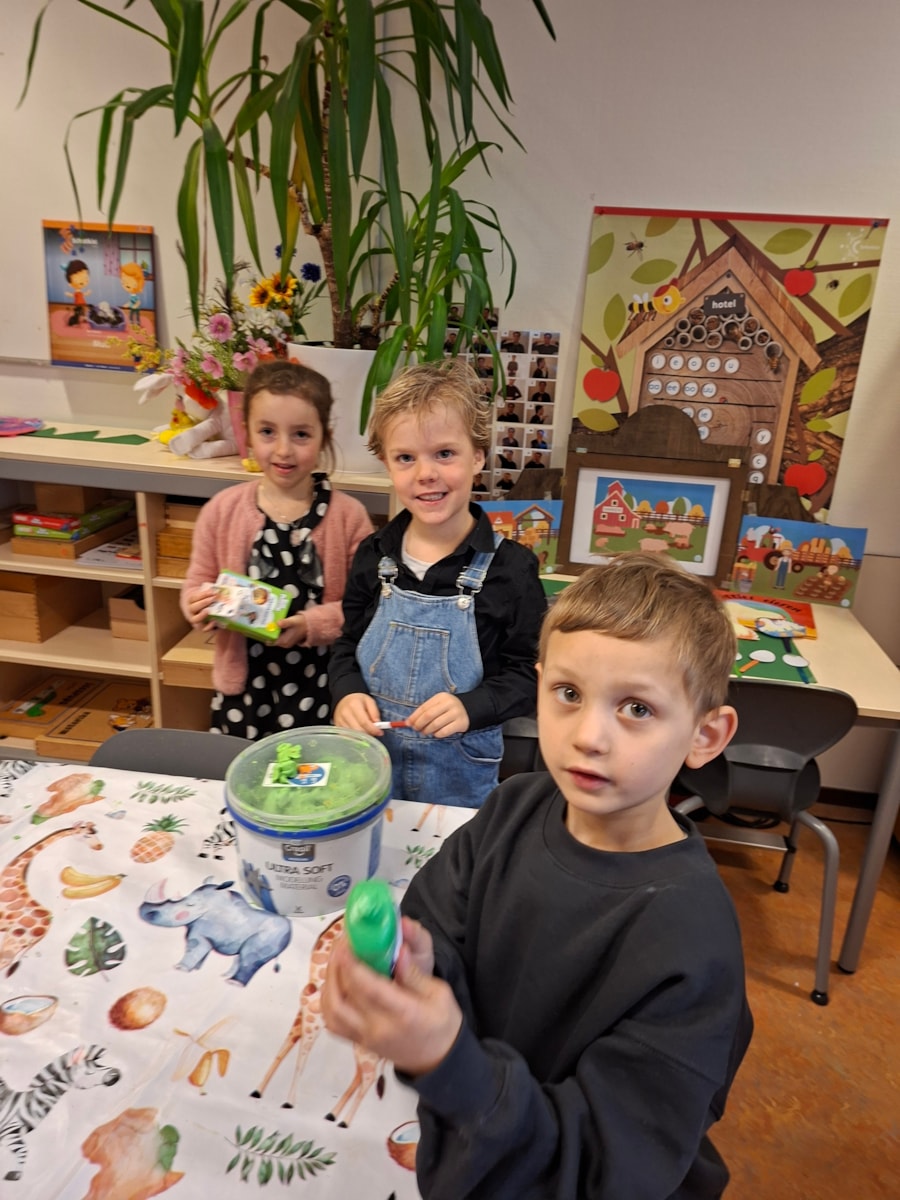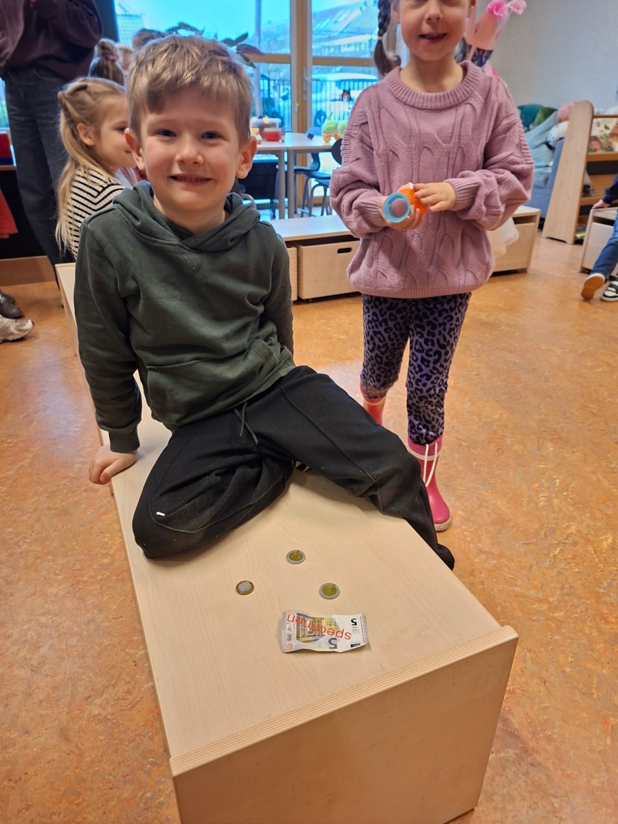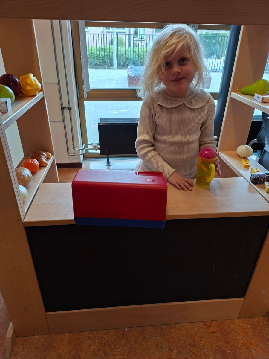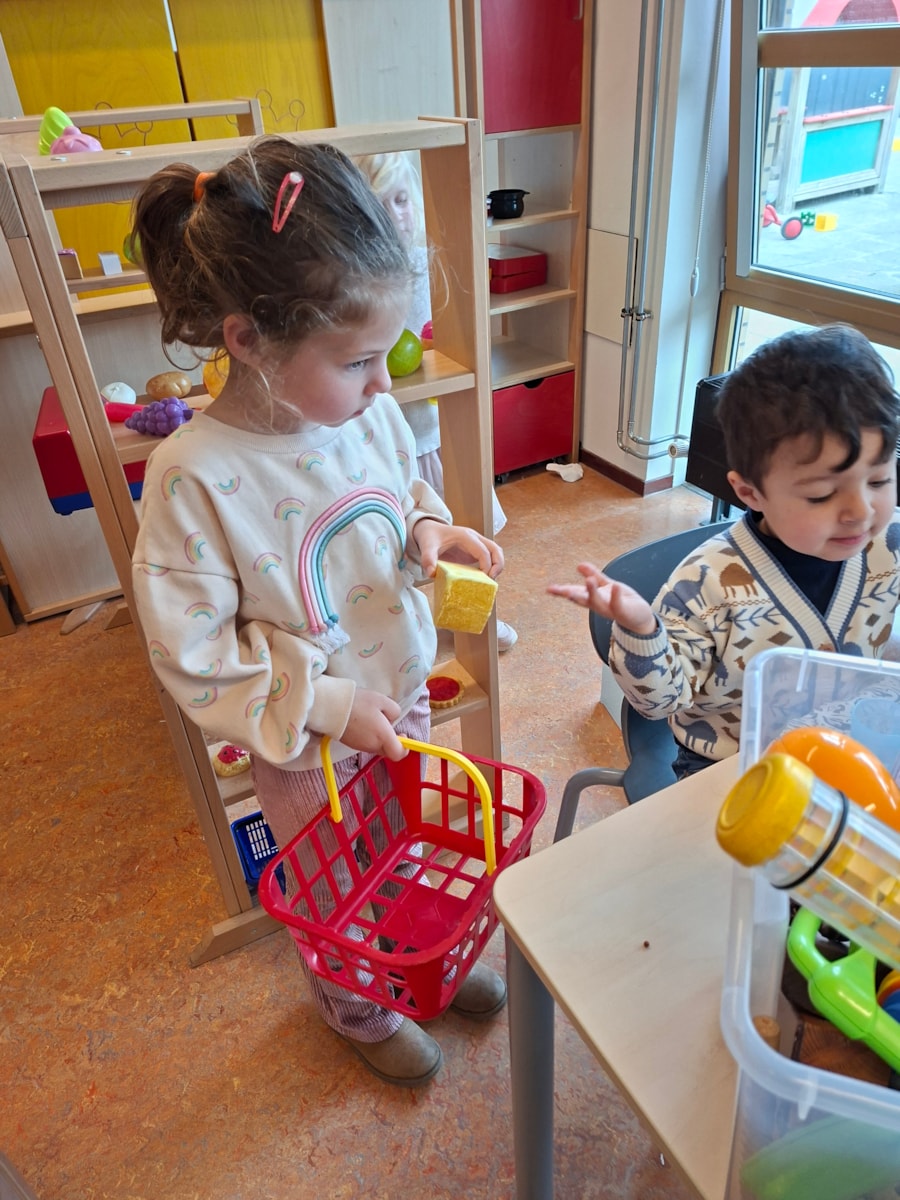 We hebben samen met juf Merel geleerd over het kopen van producten in de winkel. N.a.v een praatplaat mochten de kinderen samen overleggen wat ze allemaal konden zien op de plaat. Daarna hebben we at in de kring besproken. Ook stonden en prijzen bij. Er is besproken wat iets kost, hoeveel kost en wat nu duur is of goedkoop. Ook is er besproken waarmee we dan betalen, met muntjes en met briefjes en het zijn dan euro’s waar we mee betalen. Samen met de kinderen heeft juf Merel een winkel gemaakt. In tweetallen mochten kinderen ook artikelen kopen in de klas en dan gepast betalen met munten van 1, 2 of briefjes van 5 euro. Iedereen was actief betrokken bij deze activiteit.