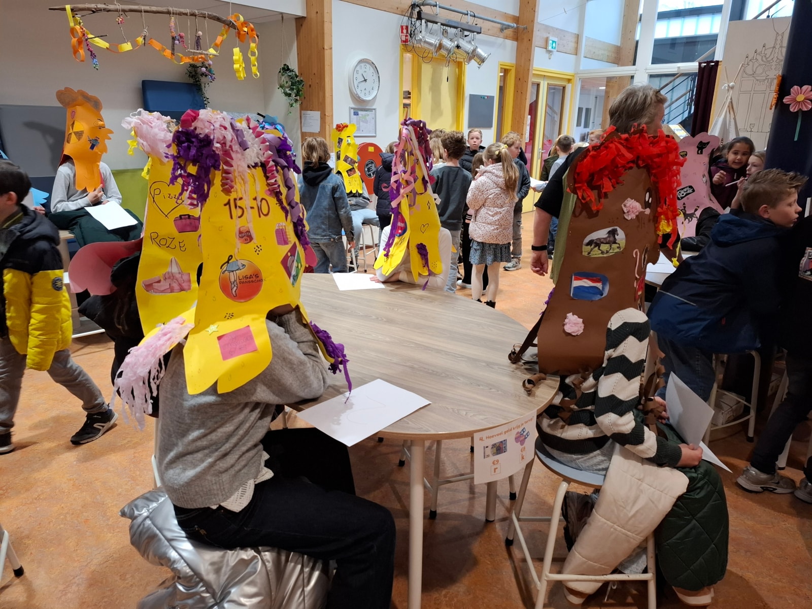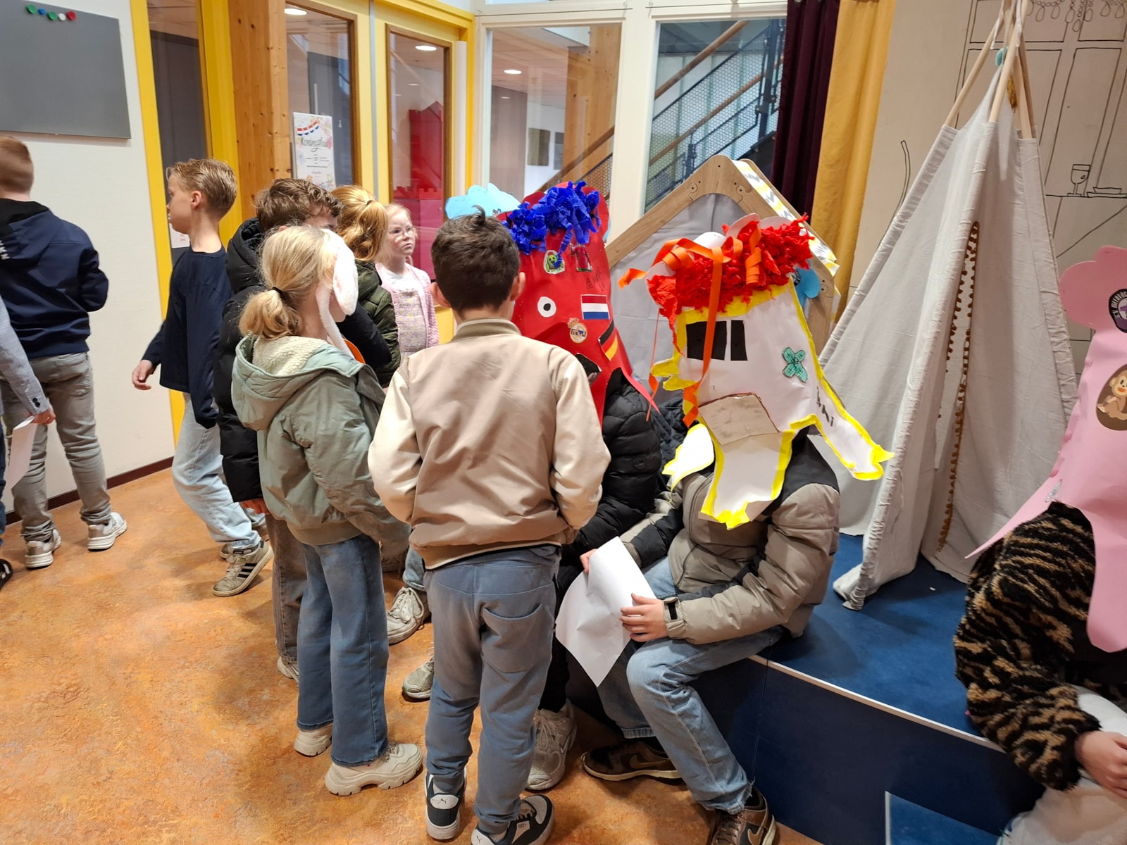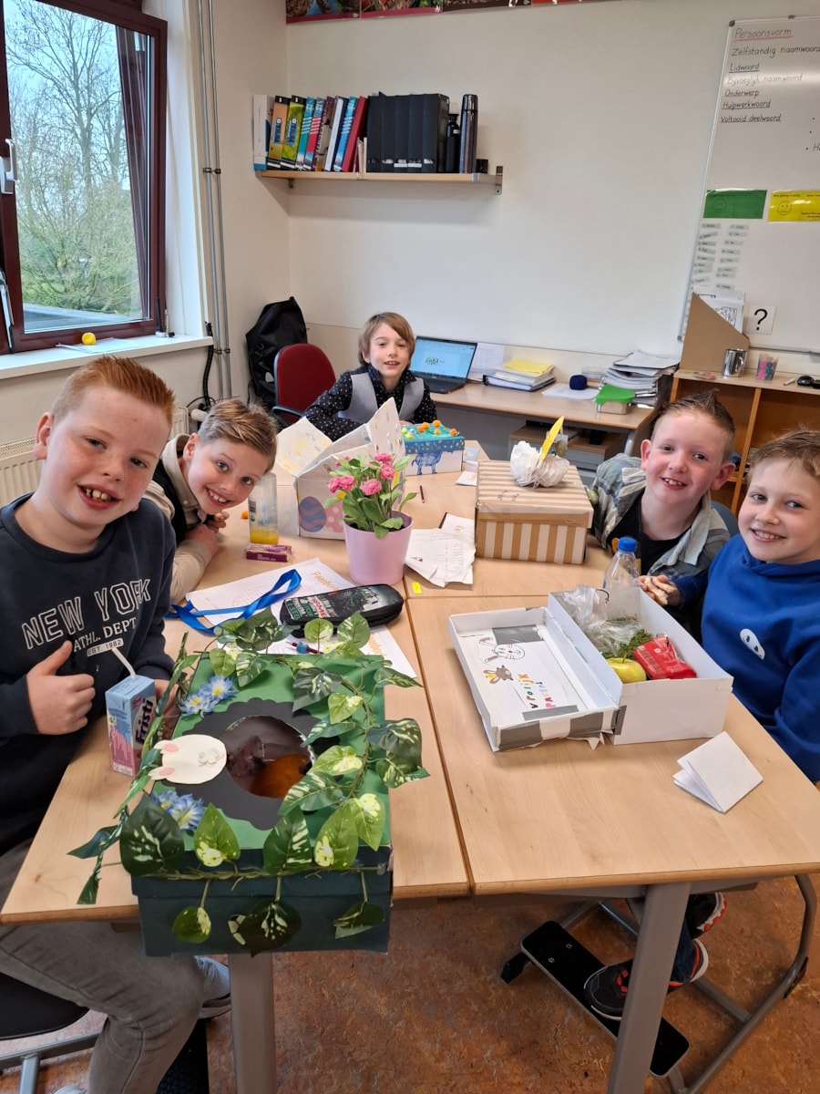 Na de pauze stond er nog een leuke activiteit op het programma. Samen met de kinderen van groep 4 hebben we geraden welk kind uit groep 8 onder de kippenkop verstopt zat. Door goed te kijken en te luisteren naar de aanwijzingen – zoals hobby’s, lievelingseten en sport – probeerden de kinderen te ontdekken wie het was. Er werd fanatiek meegedacht en goed geraden!